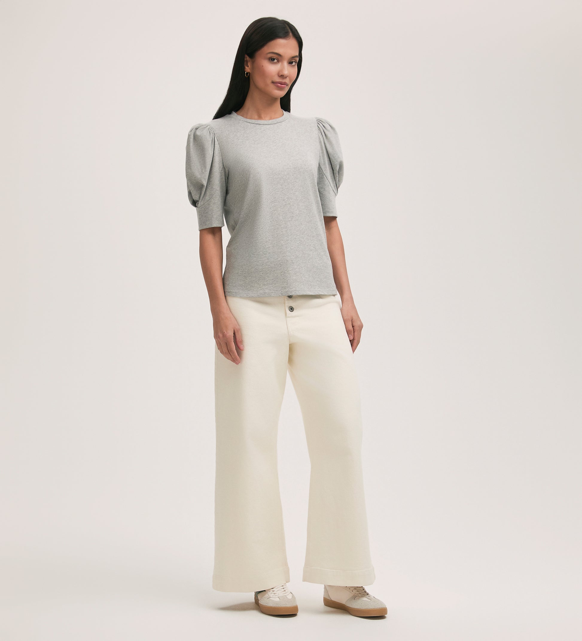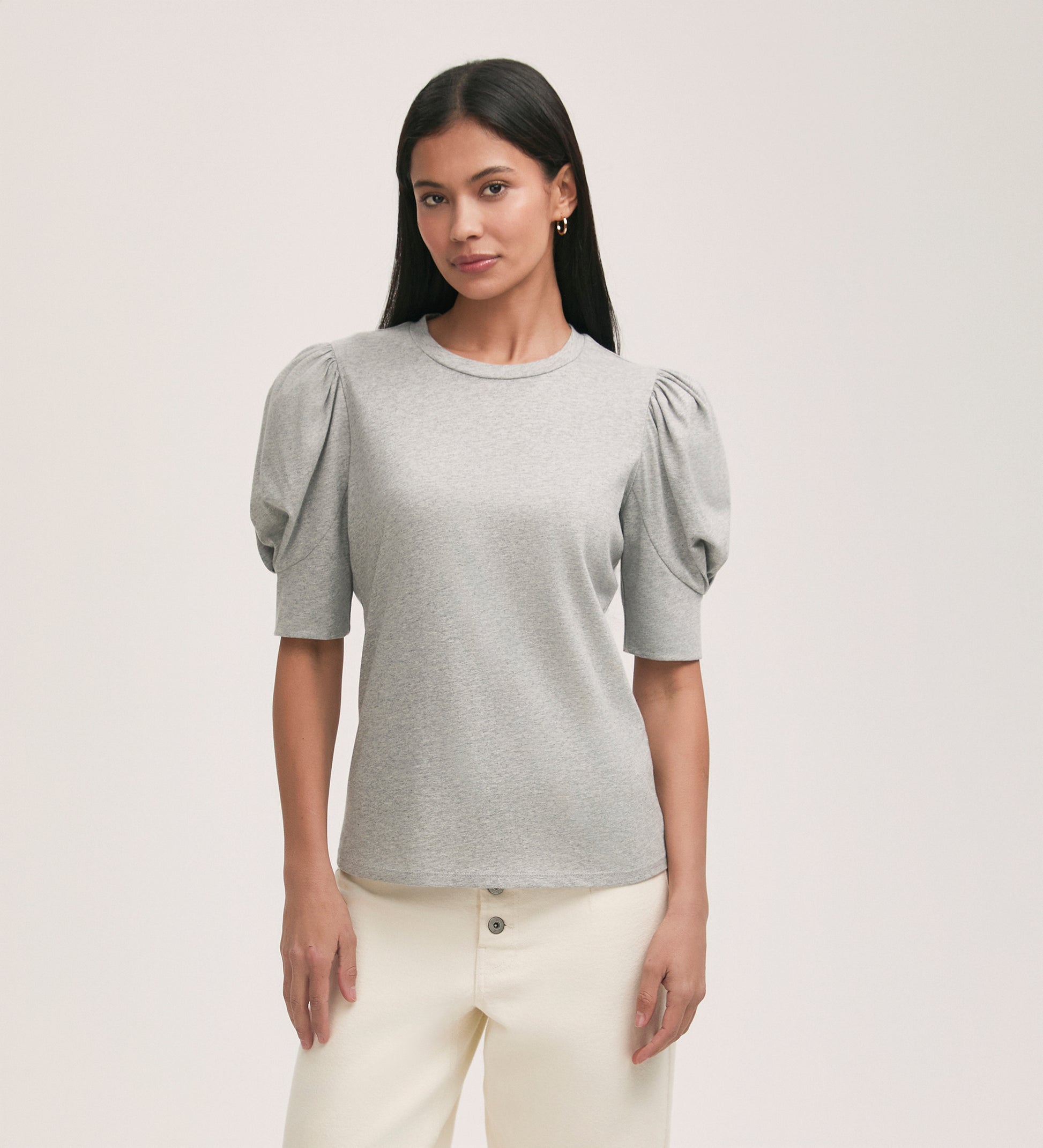 A grey crew-neck t-shirt crafted from our signature jersey fabric, Oriel features short sleeves with gathering detail. Flattering and versatile, she’s the perfect essential for your everyday wardrobe. Classic and crisp, this true white shade offers a fresh, timeless appeal.