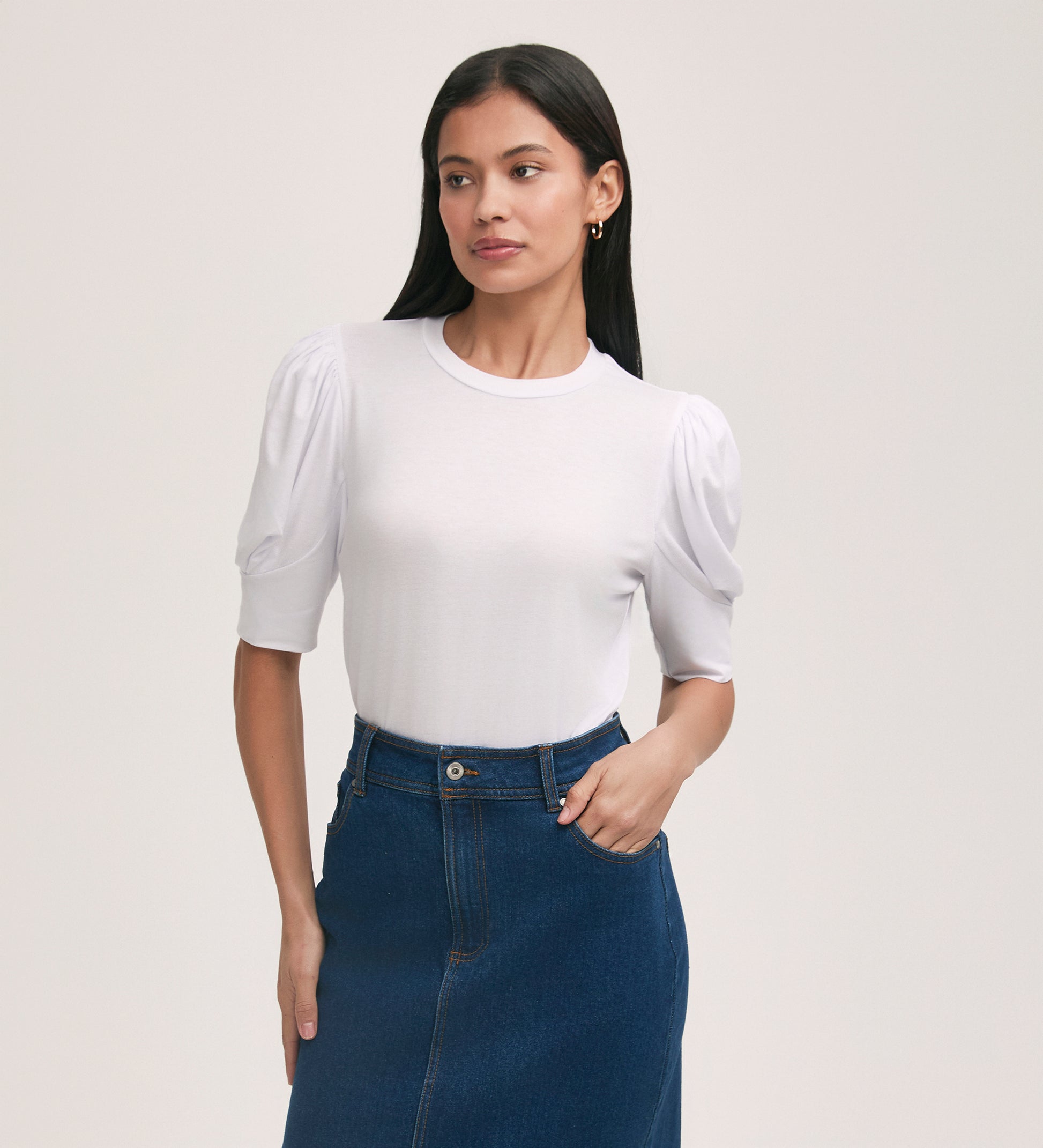 An ivory white crew-neck t-shirt crafted from our signature jersey fabric, Oriel features short sleeves with gathering detail. Flattering and versatile, she’s the perfect essential for your everyday wardrobe. Classic and crisp, this true white shade offers a fresh, timeless appeal.