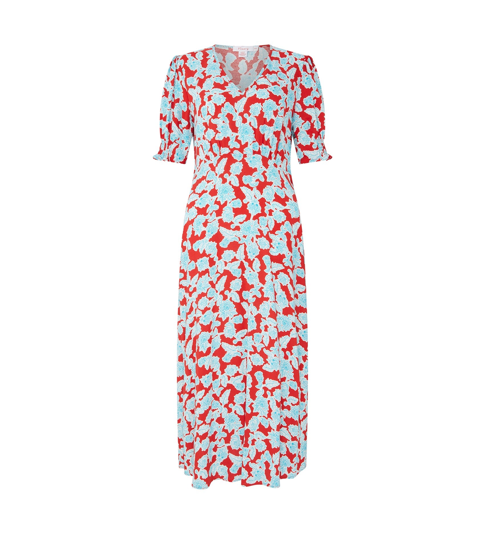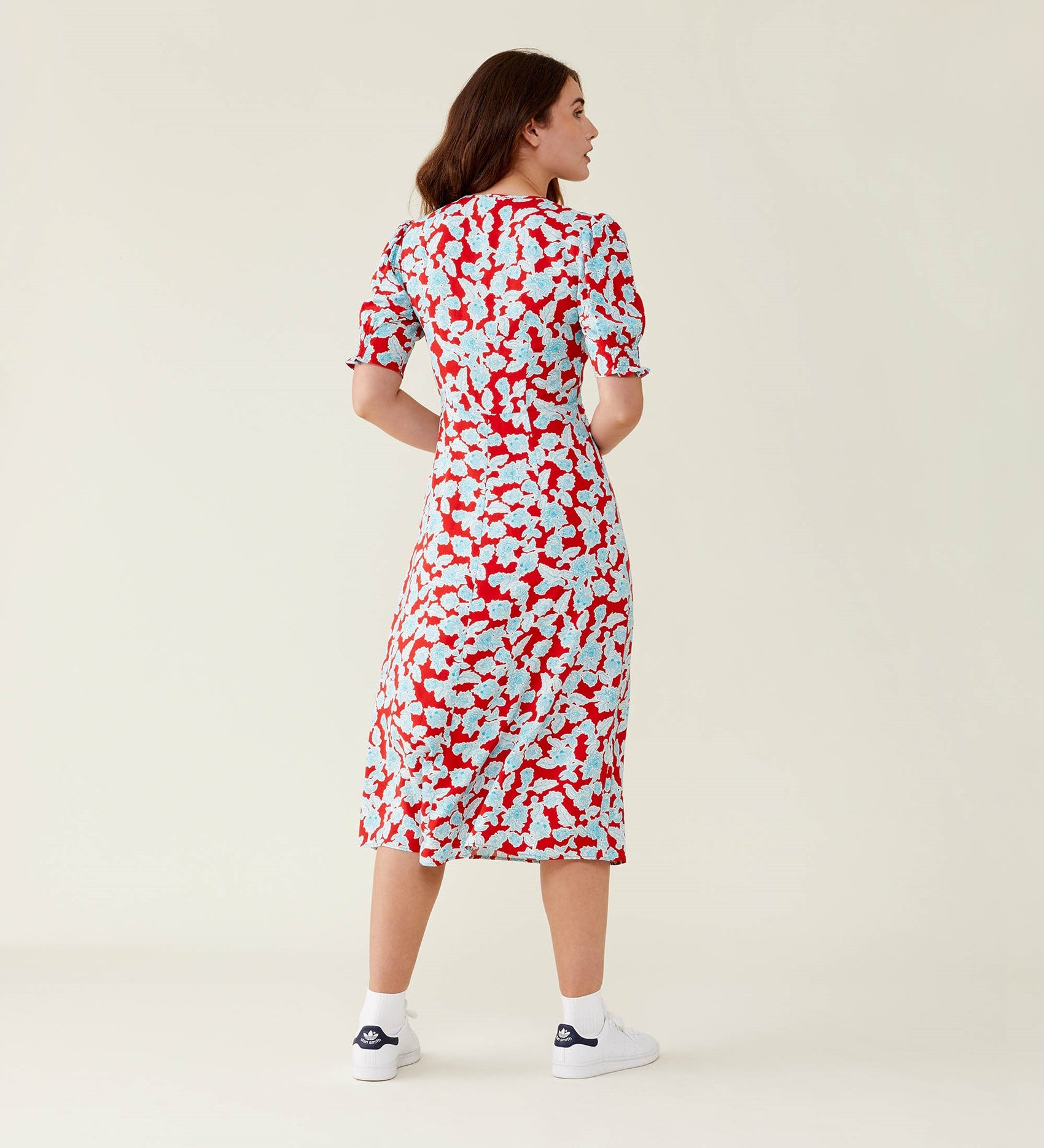In a gorgeous red floral print, Orion is a midi length dress crafted from our signature viscose. Shorter sleeves show off elasticated cuffs, while the empire line bust pulls in the wait for a flattering fit. Layer over a winter jumper and grab your comfiest boots to complete this every season look.