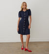 In a classic A-line shape, Paloma is a knee length dress crafted from our signature Ponte jersey with a round neckline. Buttoned through with hammered gold metal buttons, Paloma also features short sleeves that gather at the shoulder, as well as yoke detail on both the front and back of the dress.