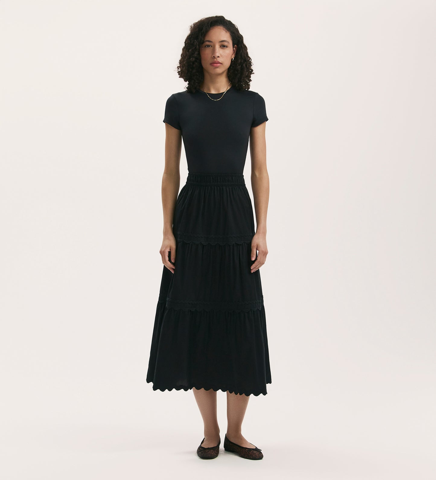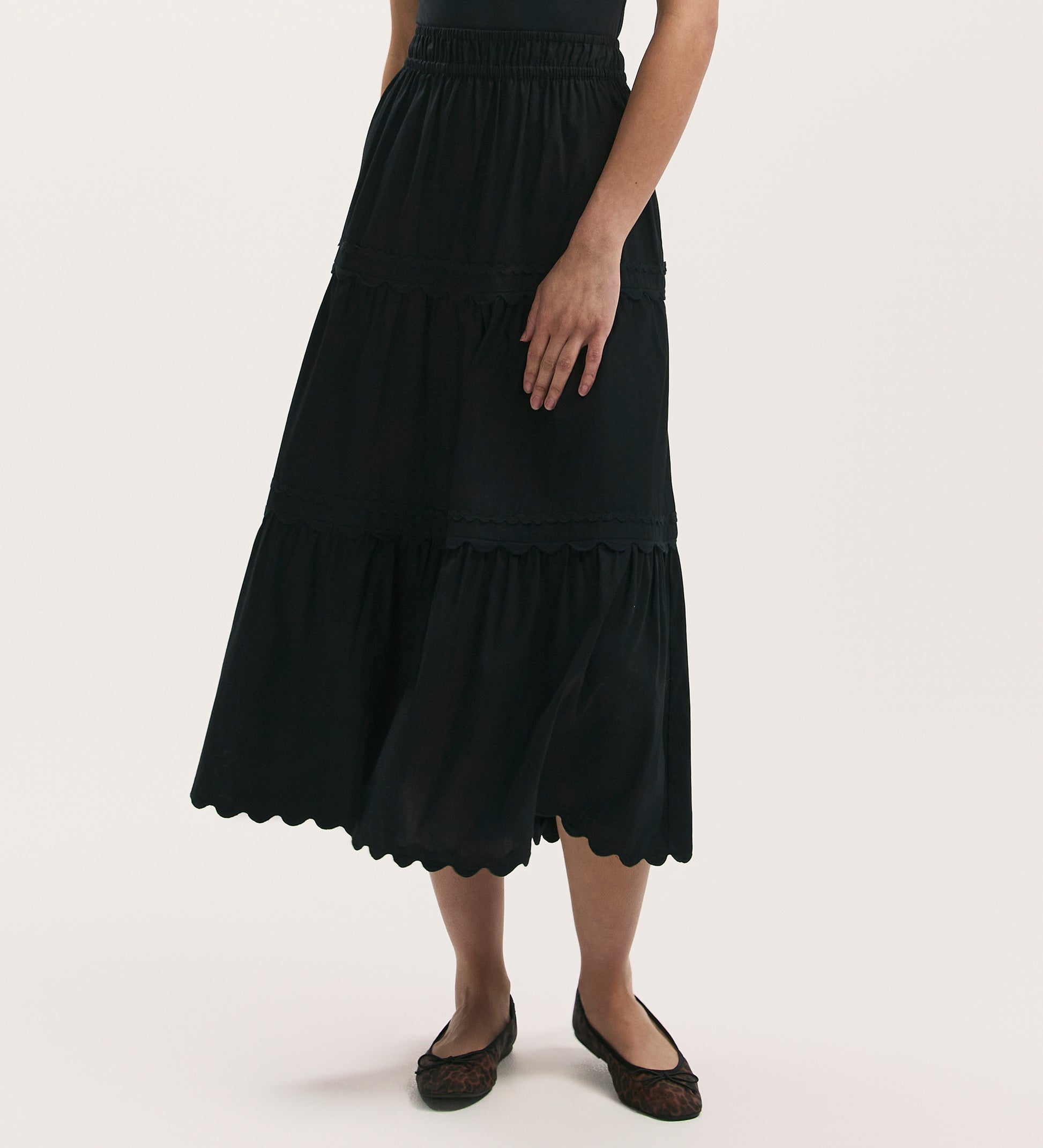 Crafted from our cotton poplin fabric, Paula is a black tiered midi skirt with a comfortable and figure-flattering elasticated waistband. She also features beautiful ric rac detailing on the tiers and hemline.