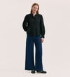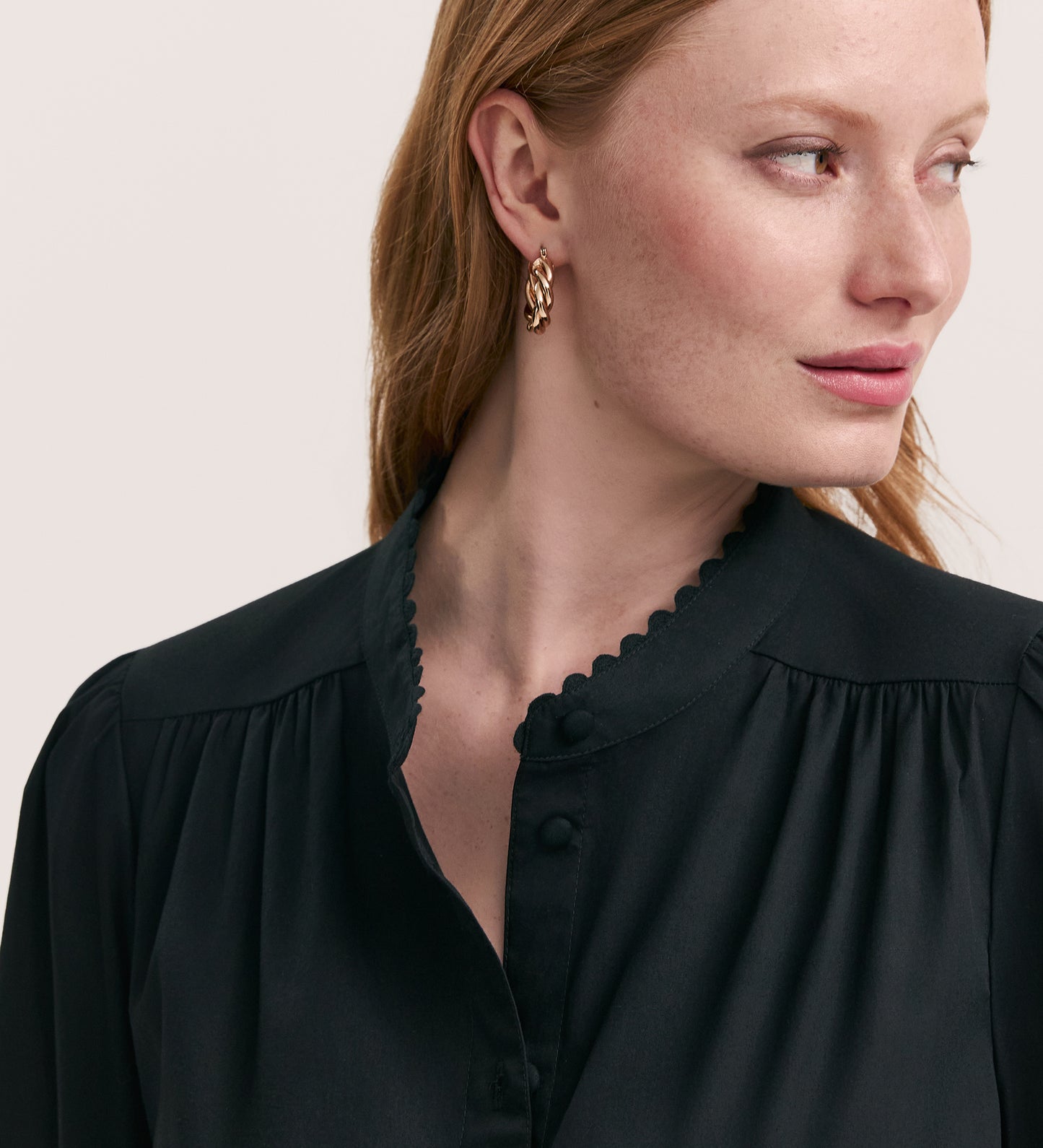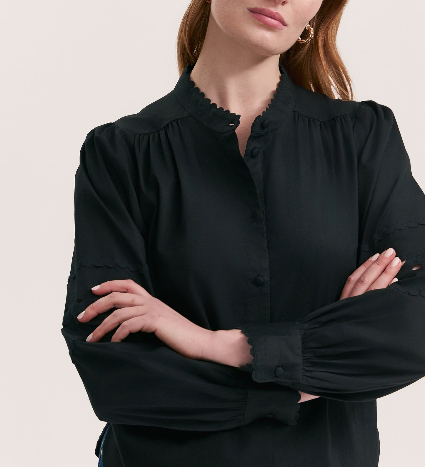 With beautiful ric-rac trim detail along the collar, sleeves and cuffs, Paulie is a relaxed-fit black cotton button-up shirt - a versatile addition for any wardrobe. She also features cotton-covered buttons and forward shoulder seam detail with gathers into the bust.