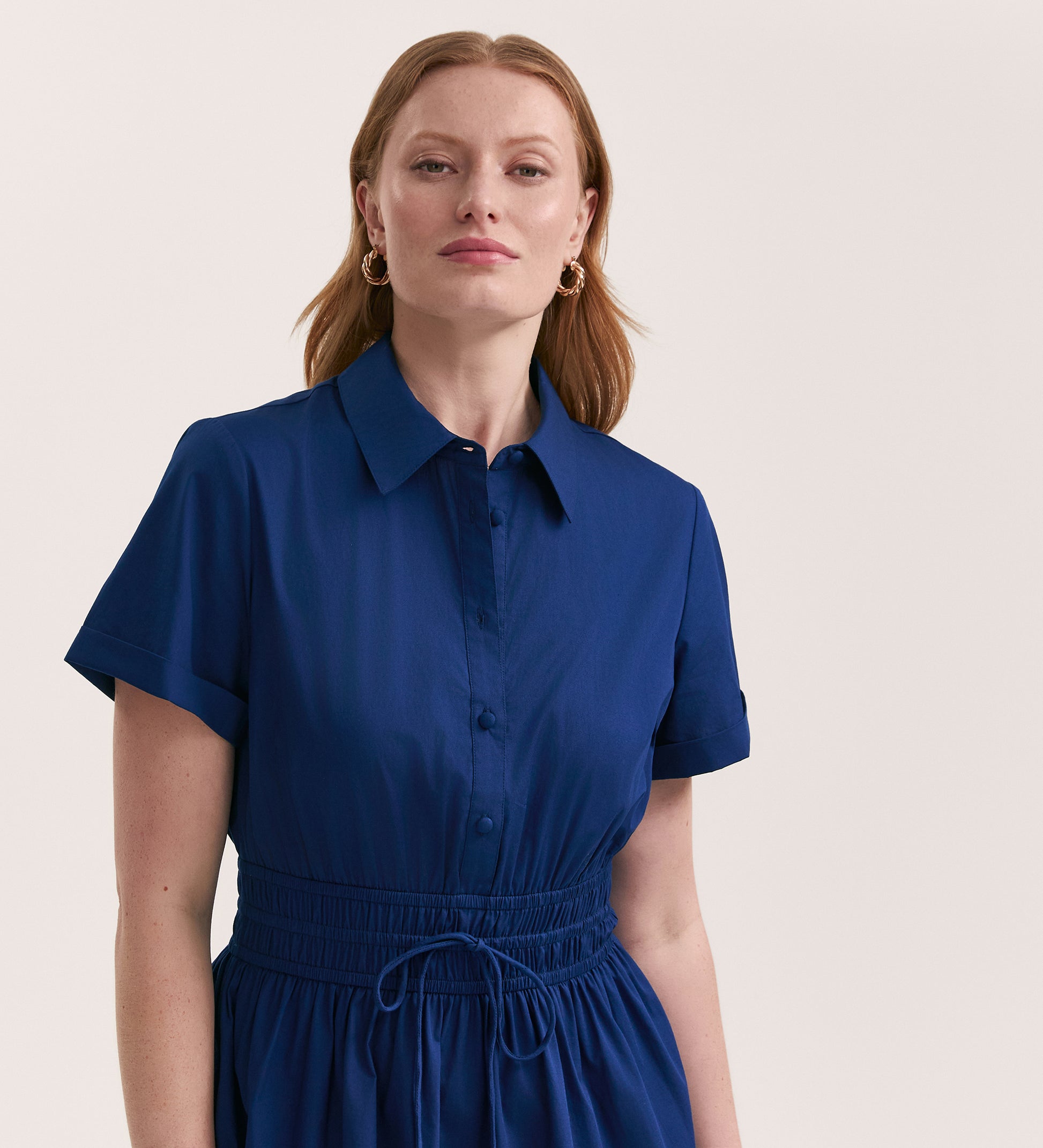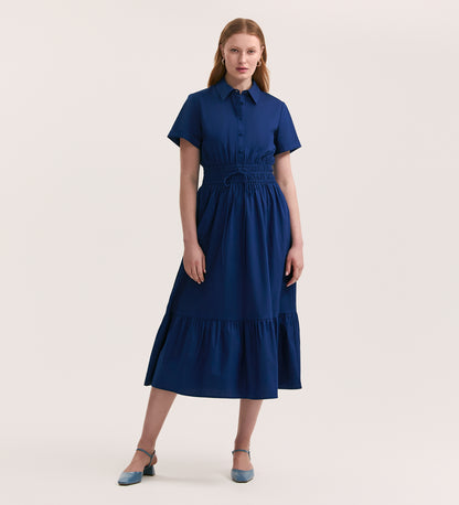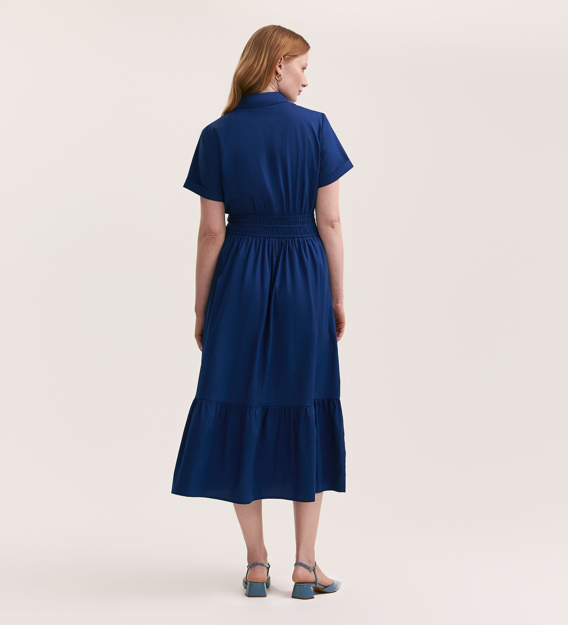 Dressed up or down, Penny is a versatile addition to any wardrobe. An indigo blue tiered midi shirt dress in cotton, Penny has three rows of elastic at the waist for an adjustable and flattering fit. She also features short sleeves, pockets and cotton-covered buttons to the waist.