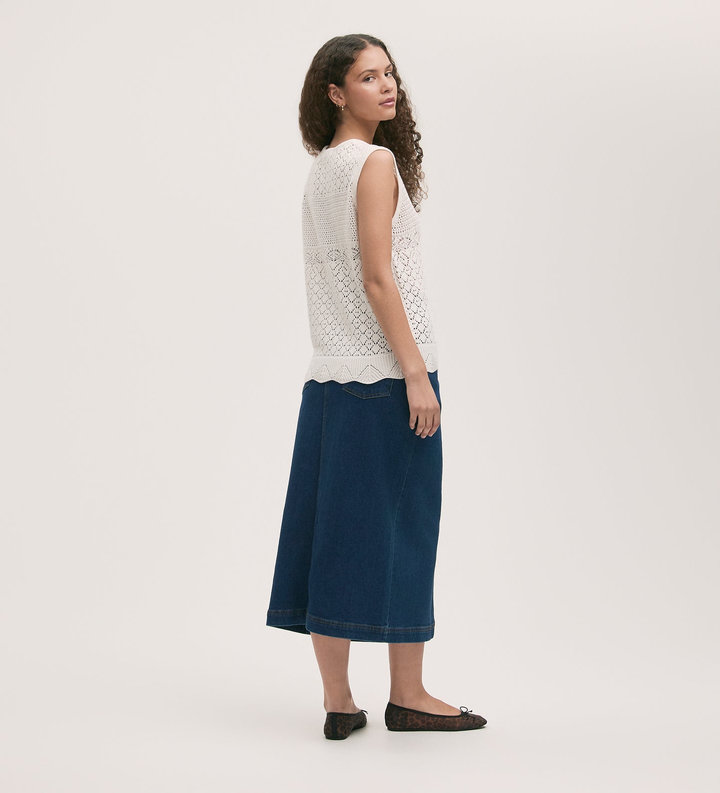 With a scallop ribbed hem and a crew neck, Porsha is our ivory white sleeveless crochet vest.