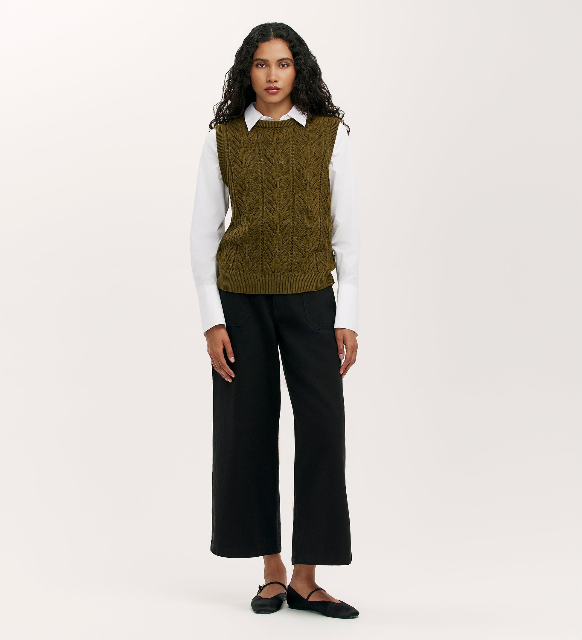 Prim is a knitted vest that combines timeless cable-knit detailing with a modern relaxed fit. Designed with a classic round neckline, this versatile layer offers endless styling potential—wear it solo on warmer days or layer over shirts and dresses as the seasons change. With its cosy texture and effortless silhouette, Prim is the perfect piece to bring comfort and character to your wardrobe year-round.