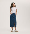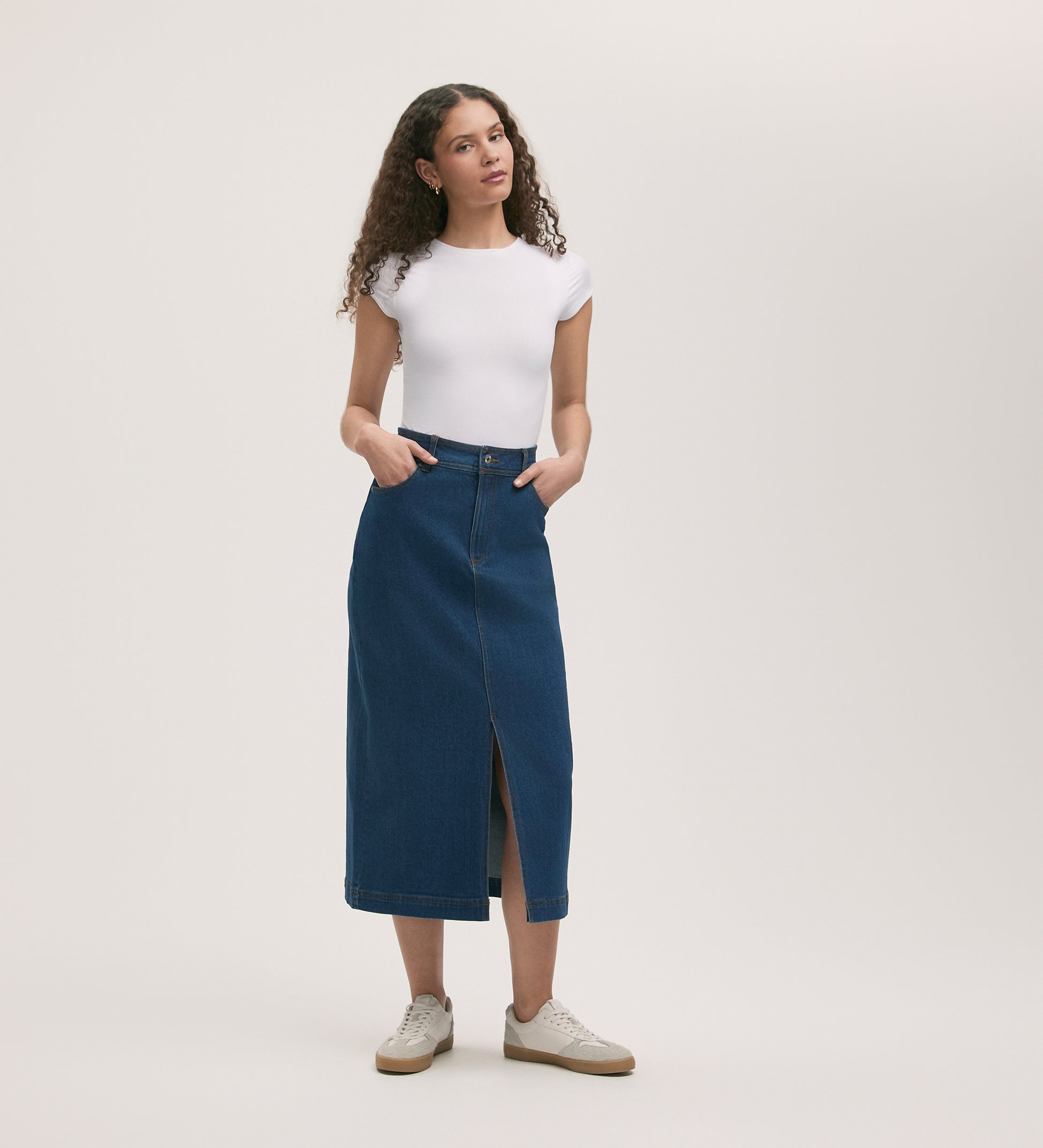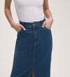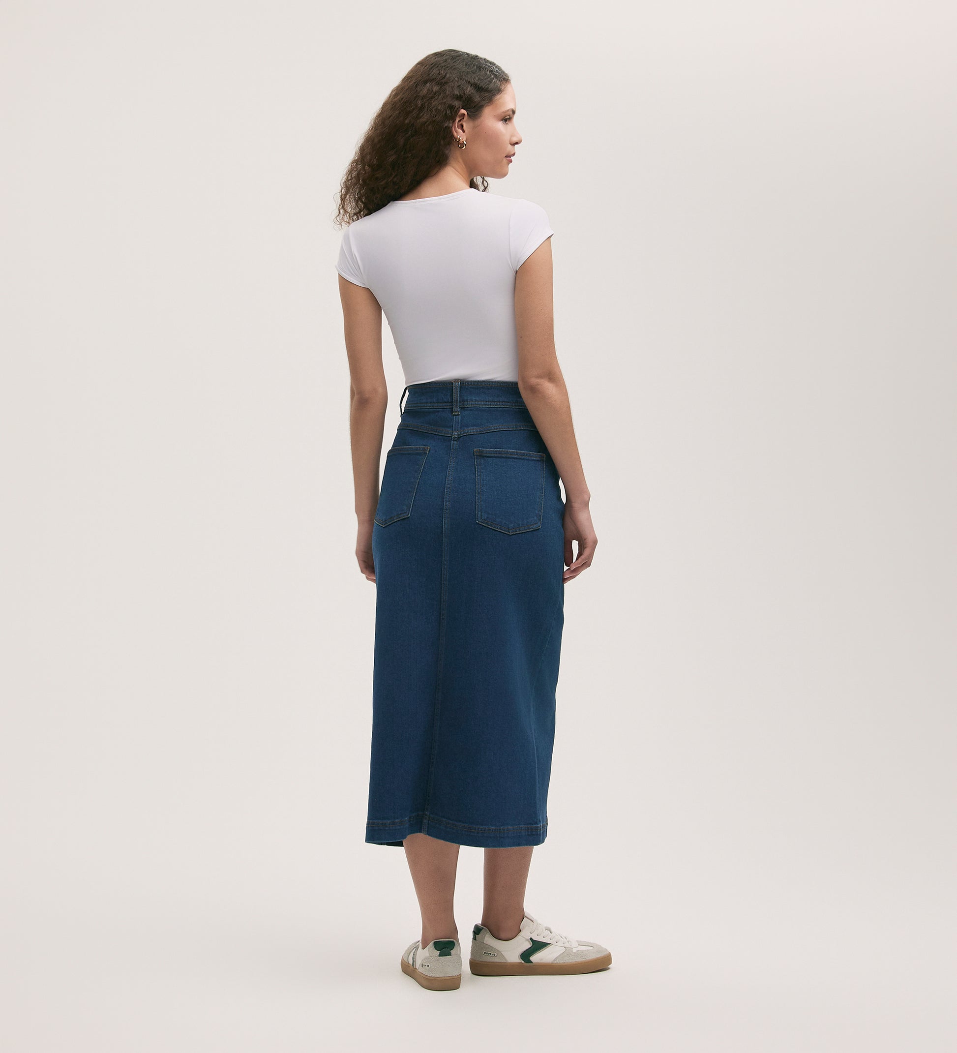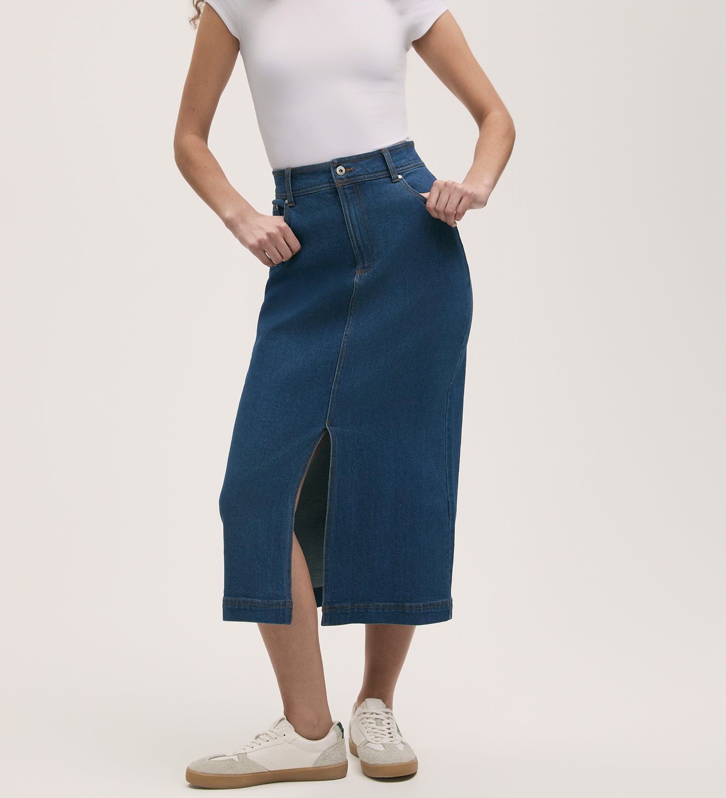 Rachel is our straight fit, mid-wash denim midi skirt, featuring a split front, 5 pockets and a fly front fastening.