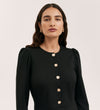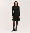 Rae is a sleek mini dress that blends polish with everyday ease. Featuring a round neckline and long sleeves, she's defined at the waist for a flattering silhouette. Crafted from Ponte jersey, Rae offers comfort with a structured finish, while gleaming gold buttons add a refined touch.