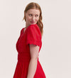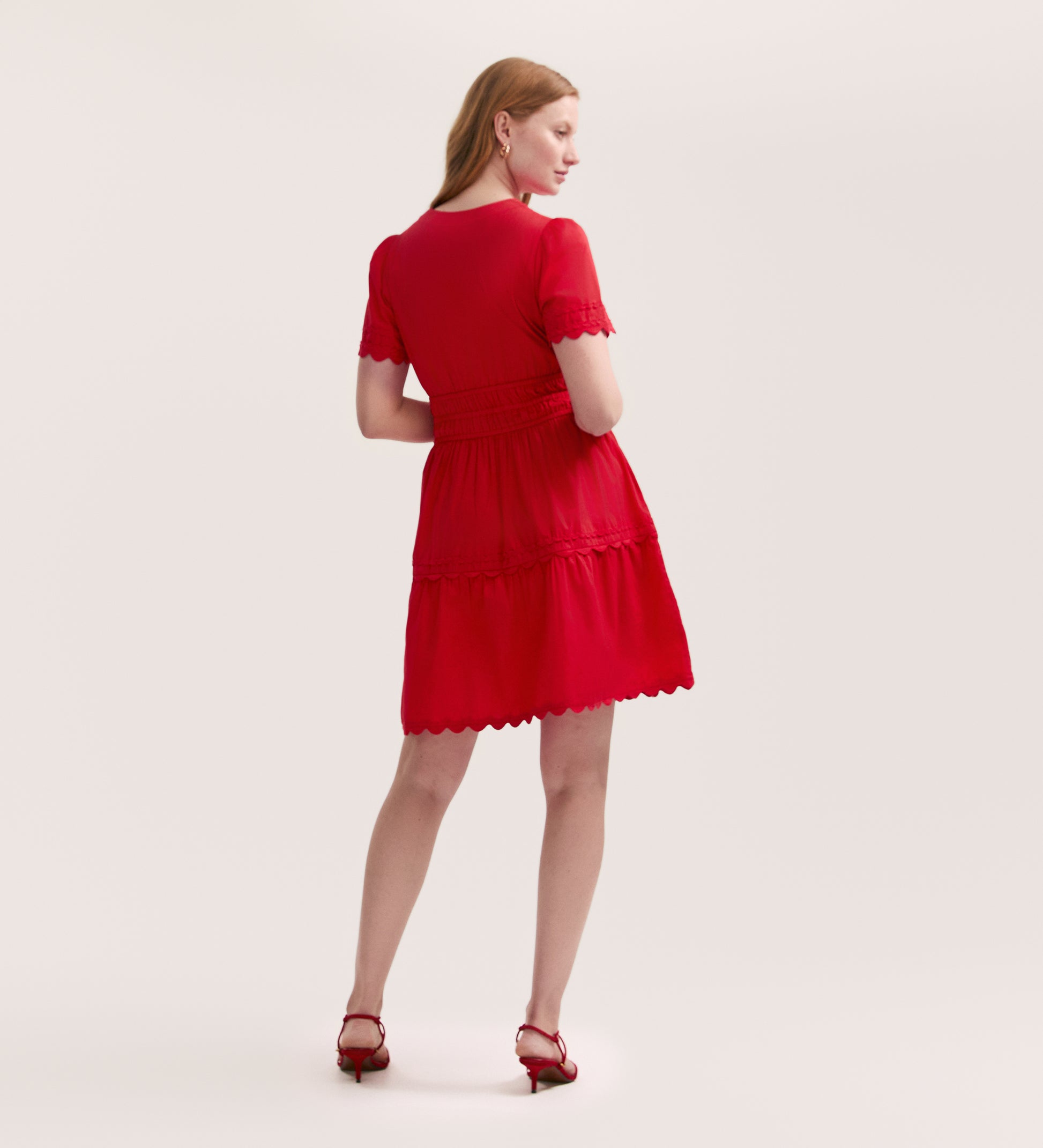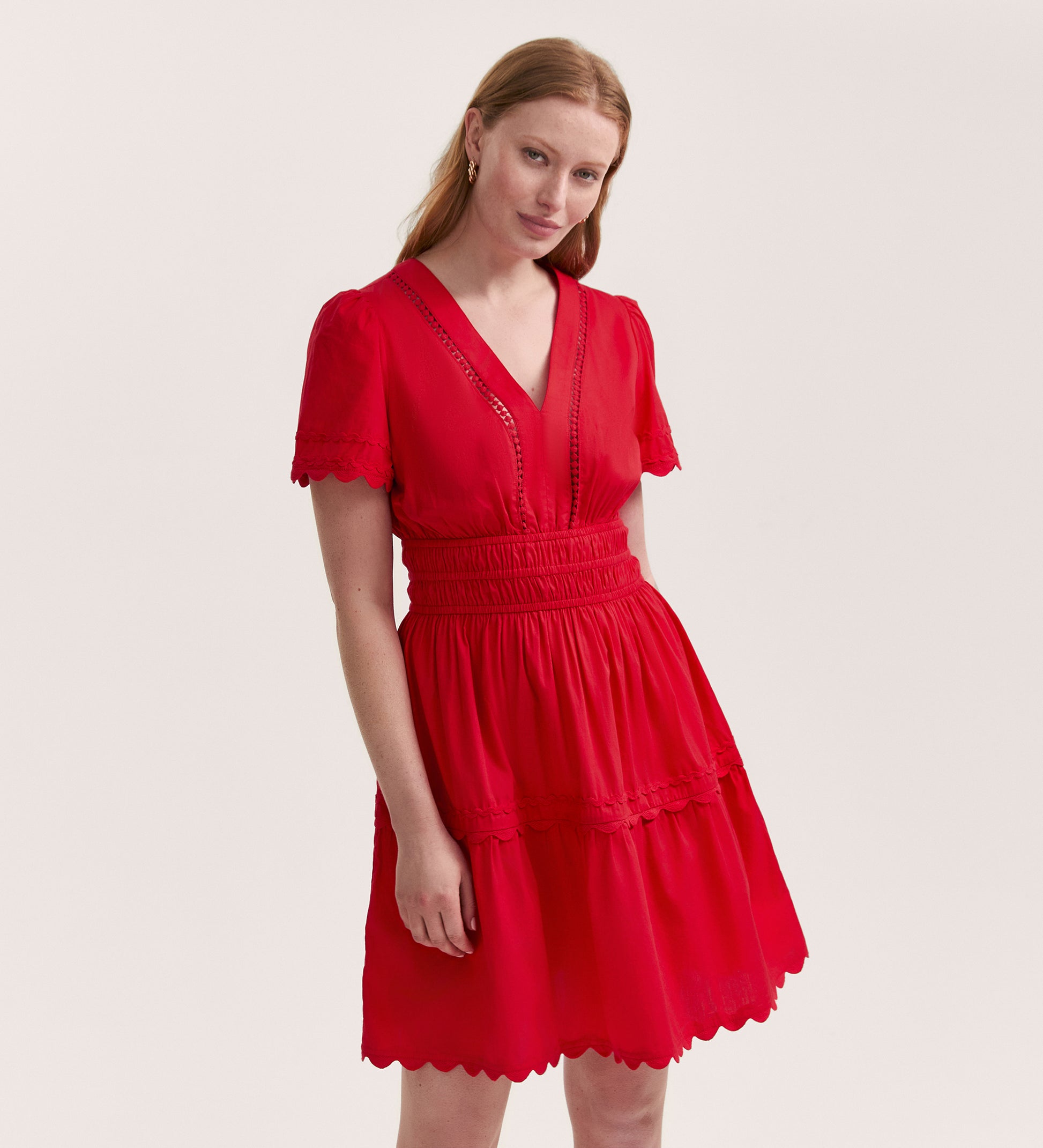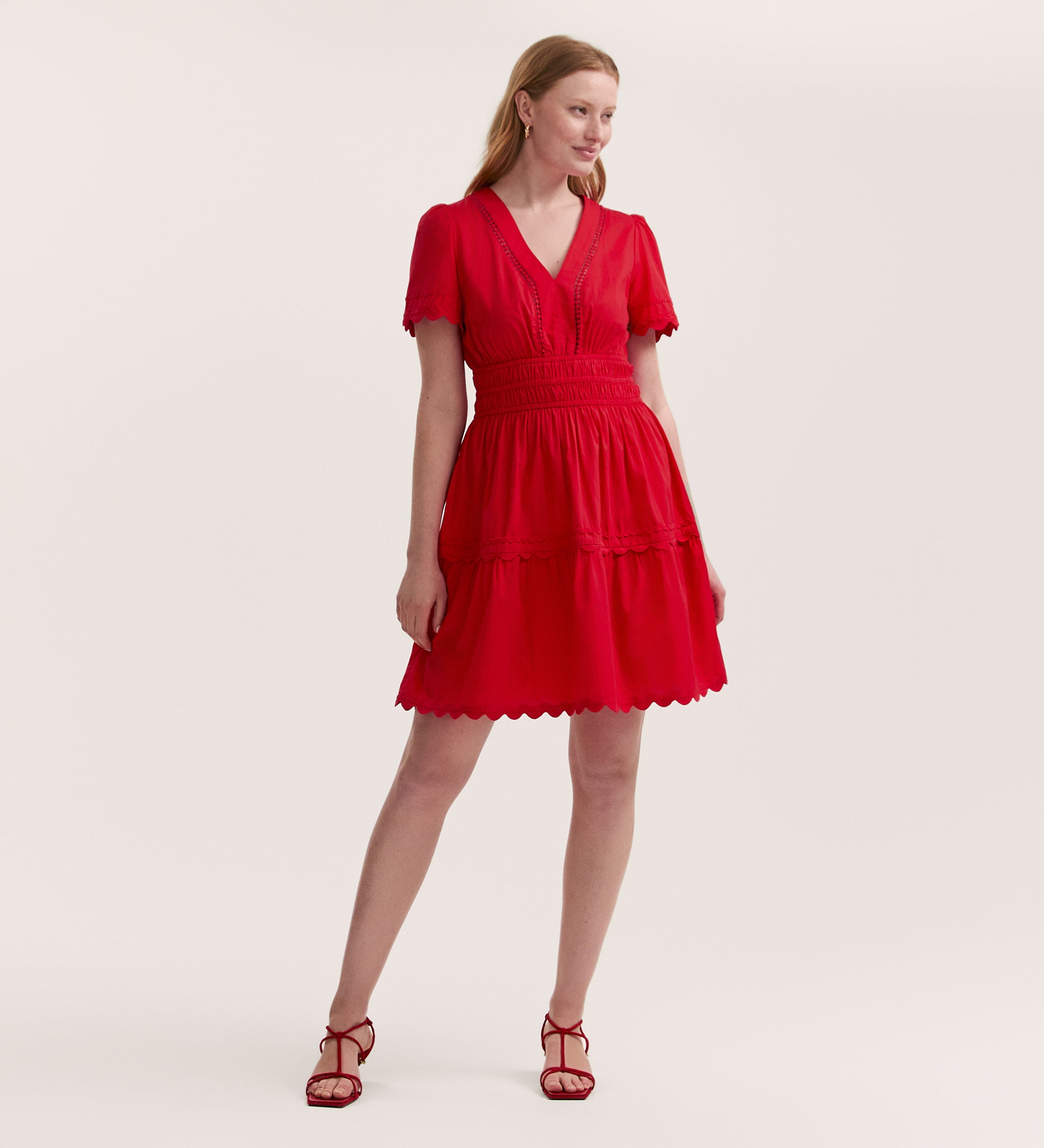 With plenty of feminine details, Reece is a red v-neck short dress crafted from cotton with three rows of elastic at the waist for an adjustable and flattering fit. Short sleeves and a tiered skirt add to the fit and flare style. Note also the ric rac trim detail on skirt tiers and sleeve cuffs, as well as eye-catching circle lace trim along the neckline.