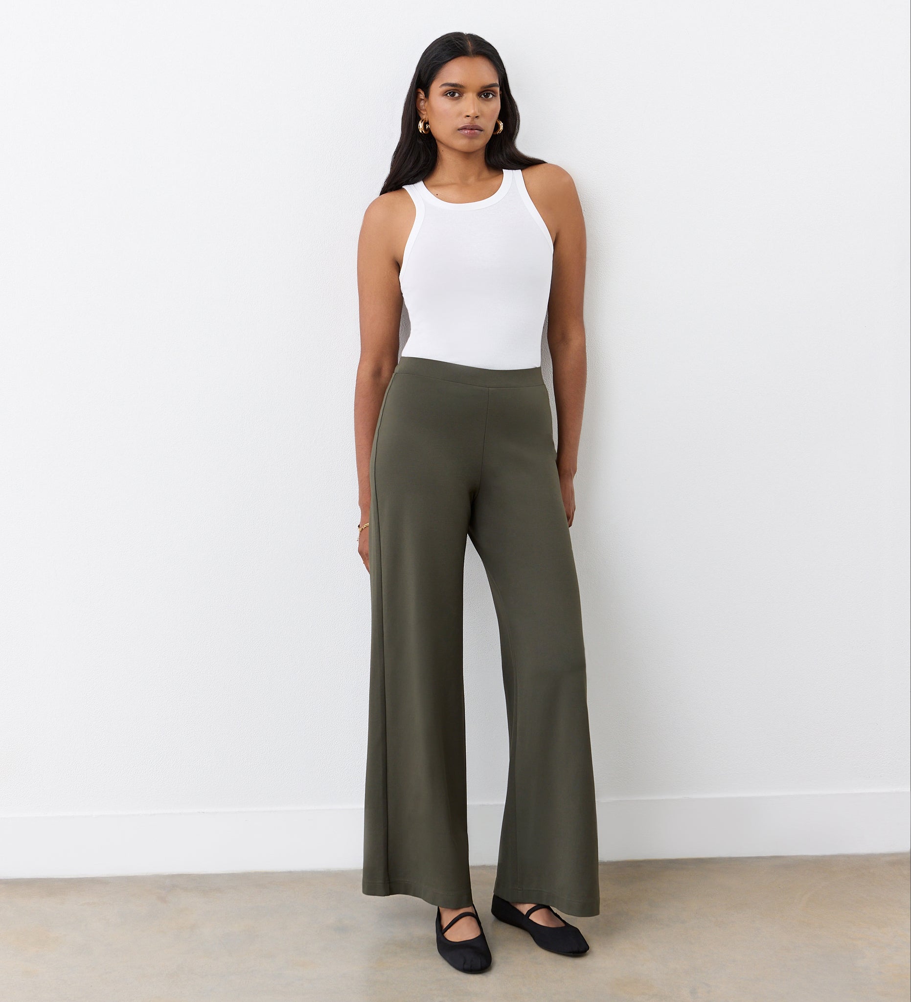Meet Reyna, our khaki wide-leg trousers, a key piece for comfort and style throughout the seasons. In a thick Ponte jersey, they have loose, wide legs and are flatteringly high-waisted. We suggest pairing with trainers or with heels.