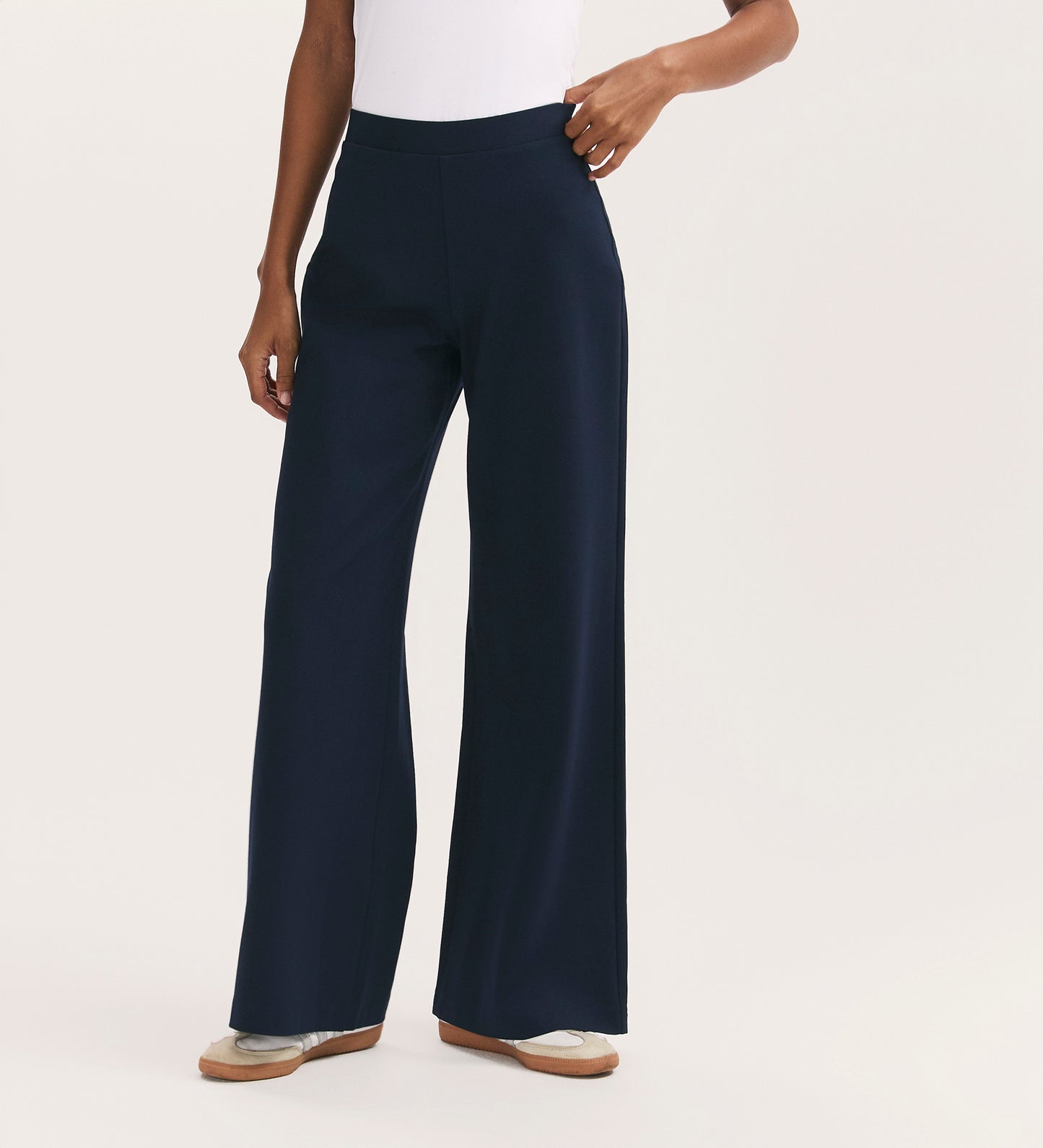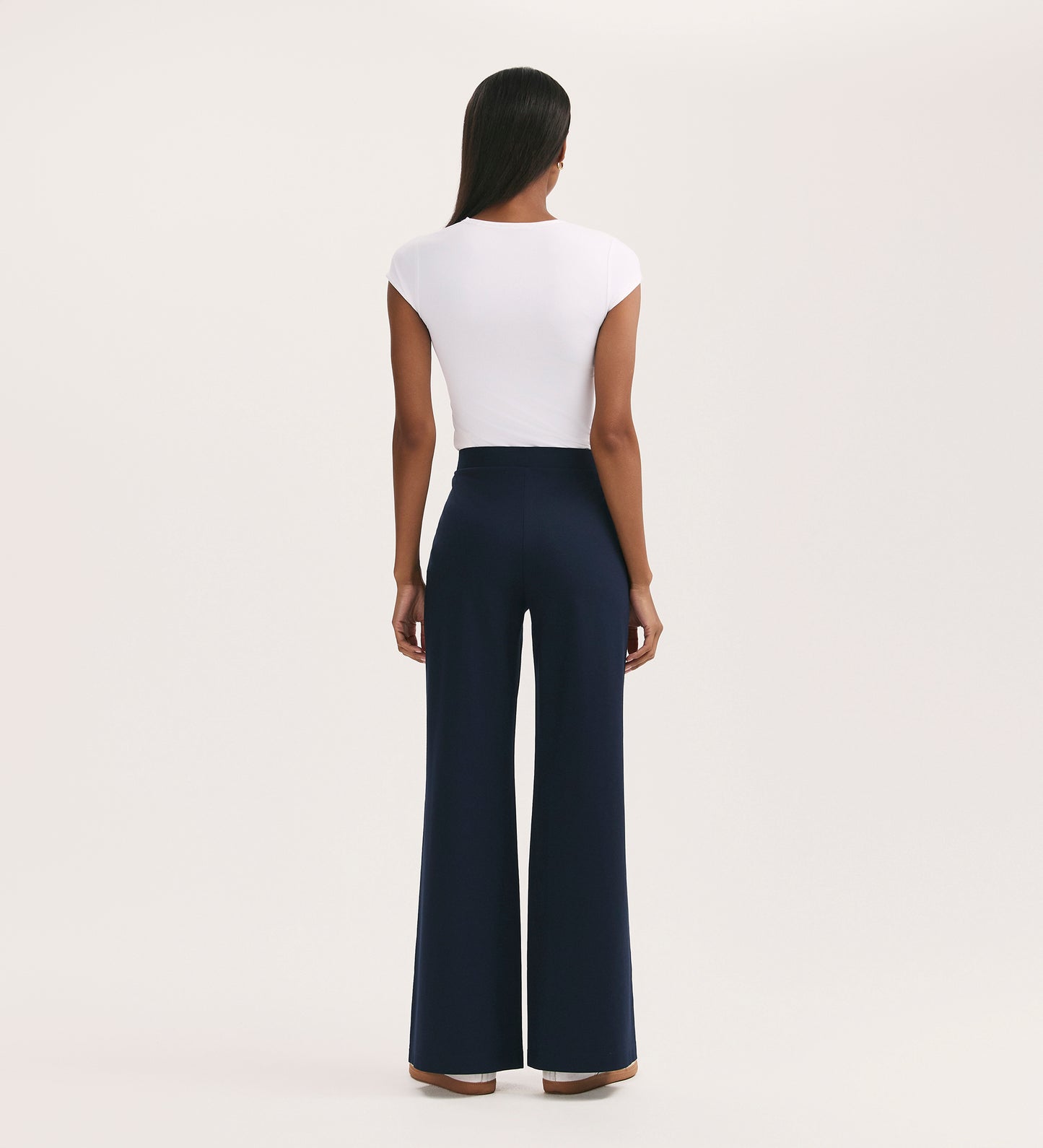 Meet Reyna, our navy wide-leg trousers, a key piece for comfort and style throughout the seasons. In a thick Ponte jersey, they have loose, wide legs and are flatteringly high-waisted. We suggest pairing with trainers or with heels.