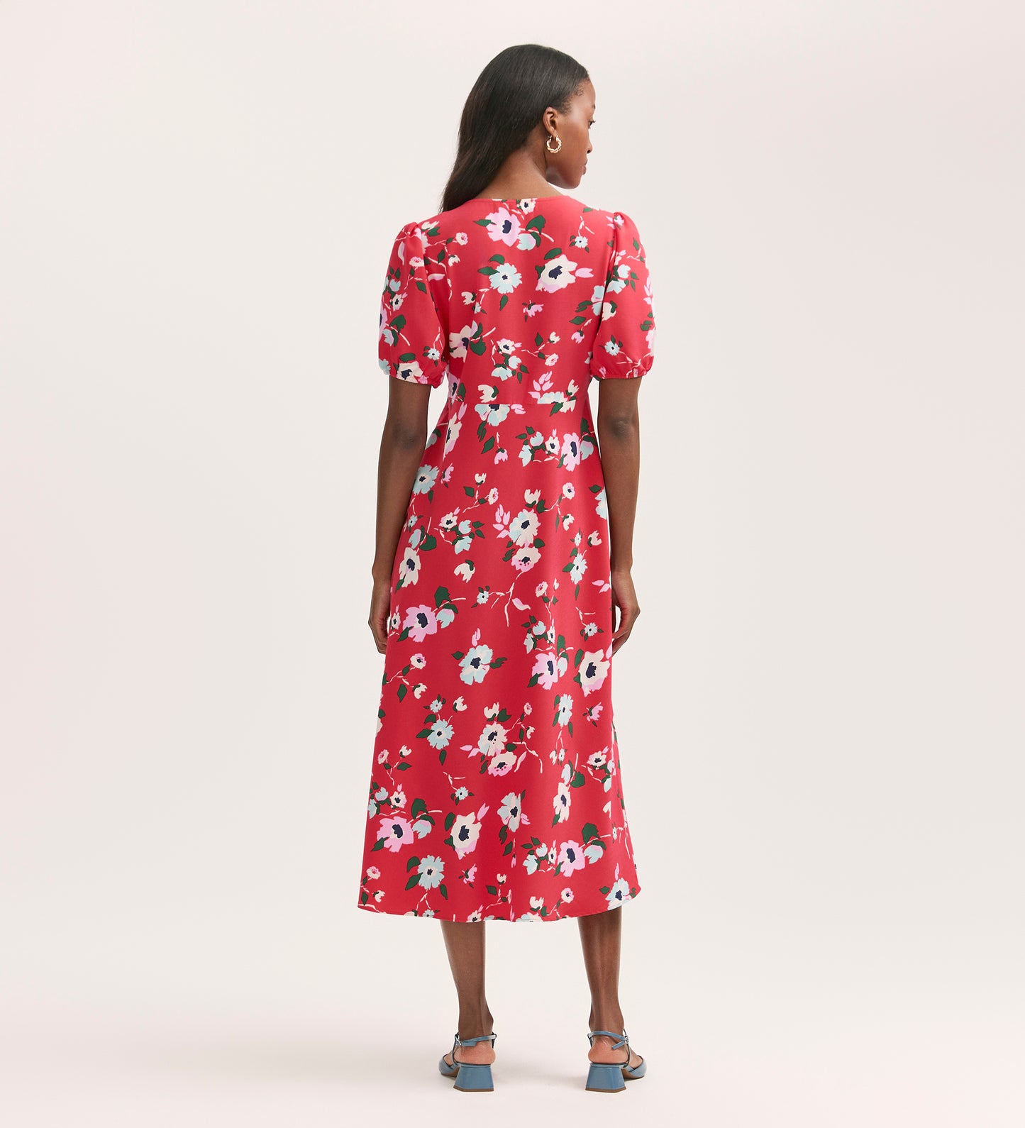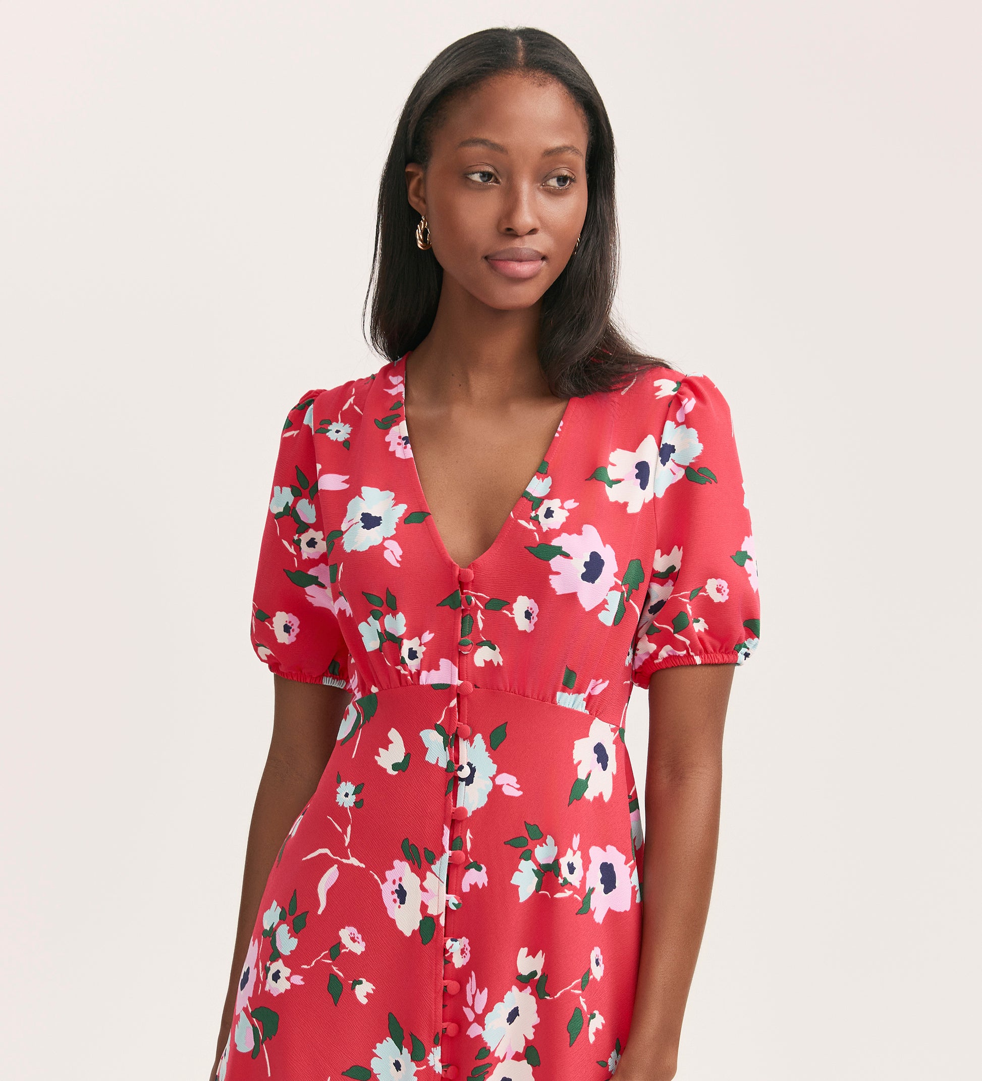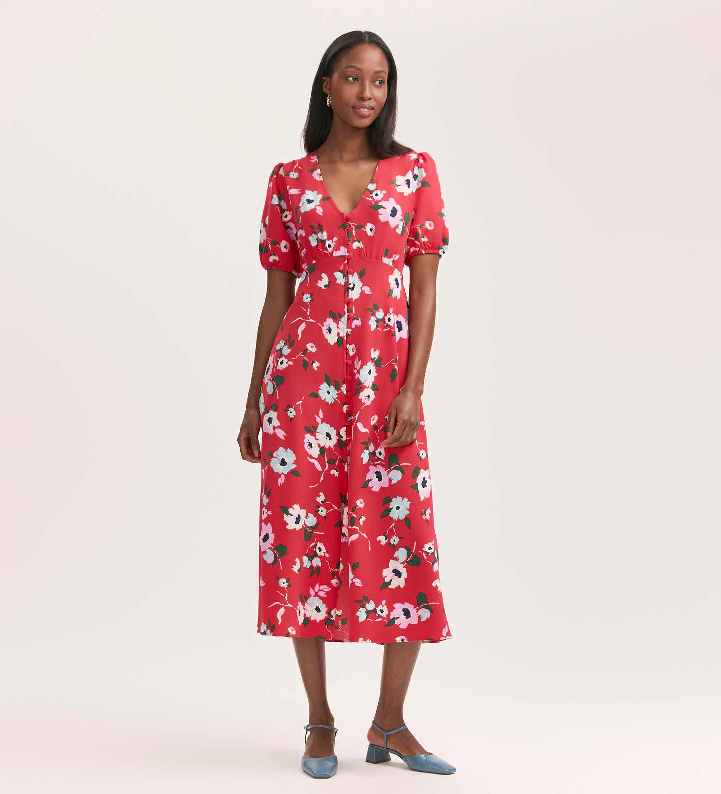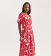 If you're looking to add a pop of colour to your wardrobe, look no further than our Robyn coral floral midi tea dress. Featuring a flattering V-neck, short puff sleeves, and button-down style, Robyn is crafted from our crease-free crepe fabric.
