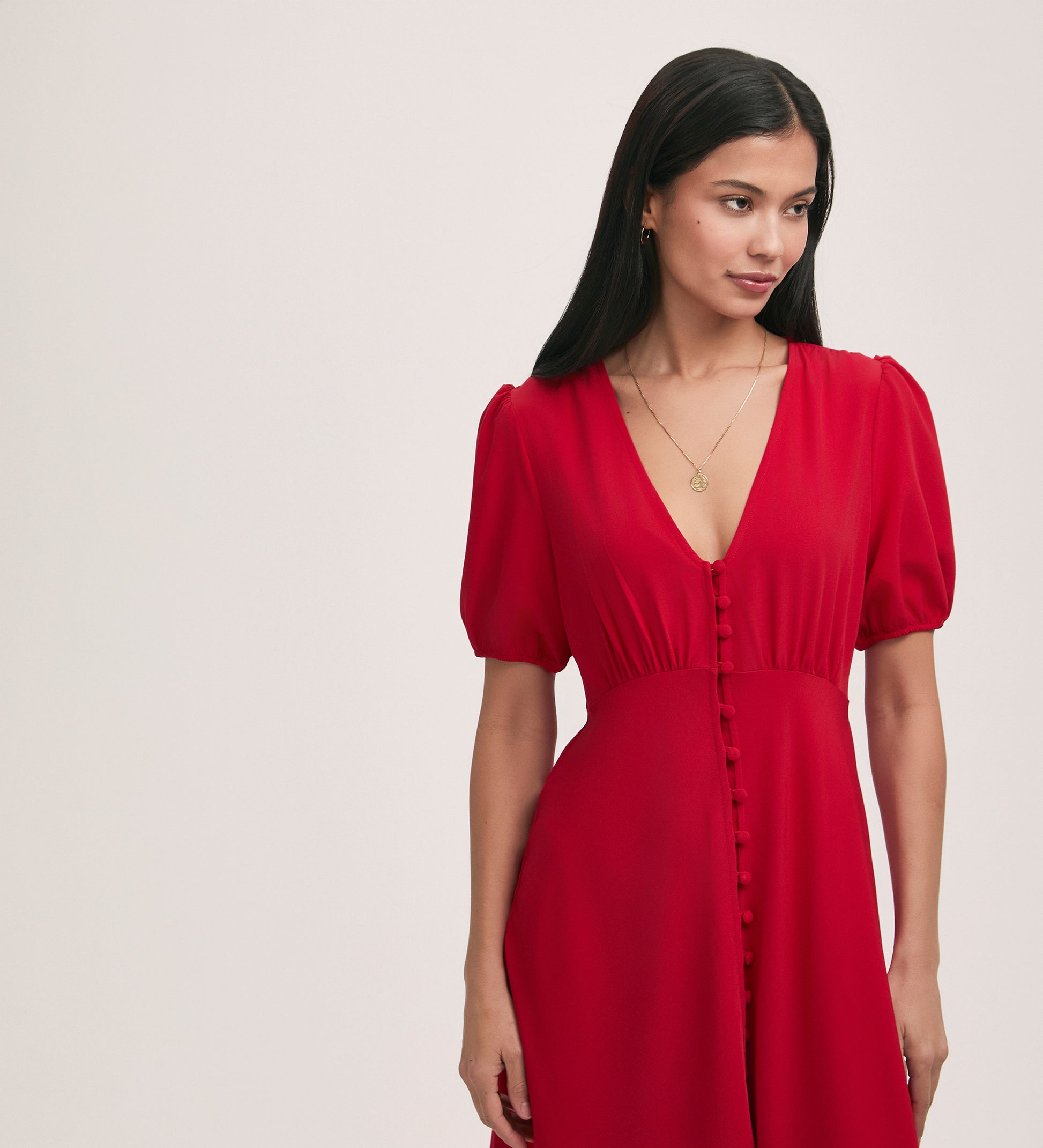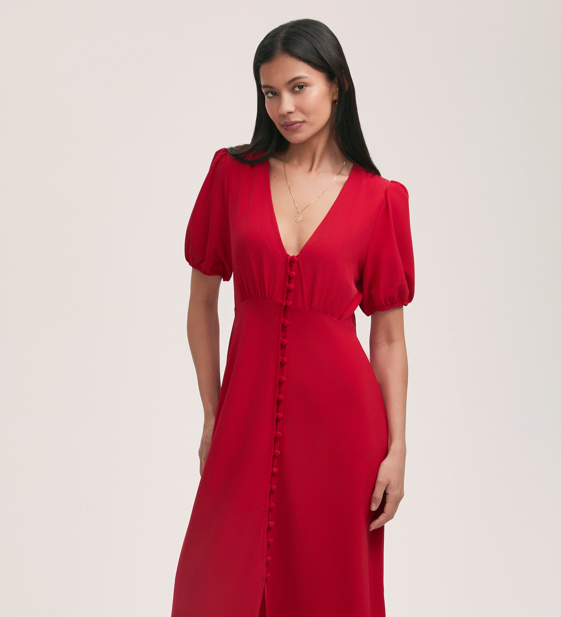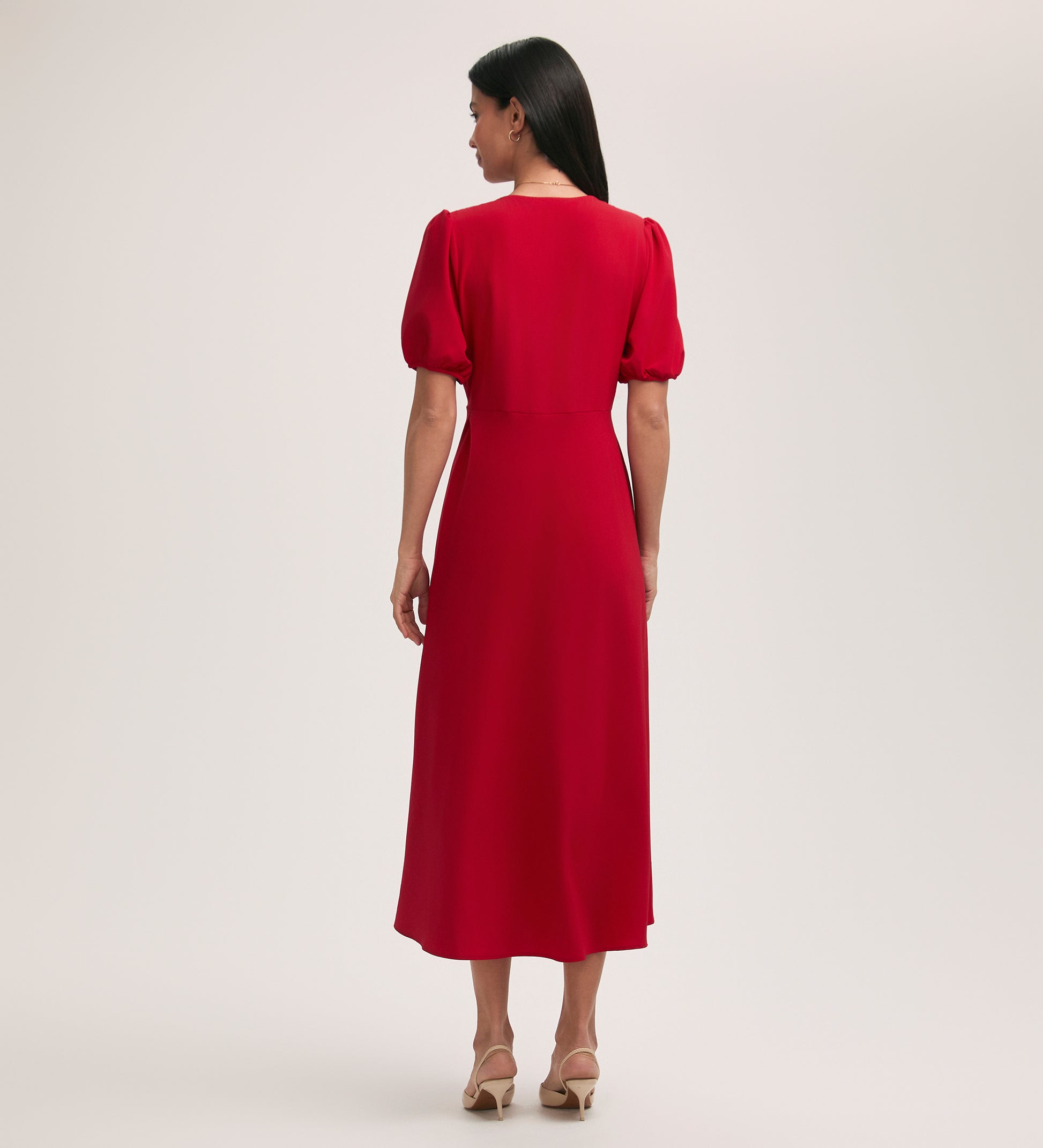 If you're looking to add a pop of colour to your wardrobe, look no further than our Robyn red midi tea dress. Featuring a flattering V-neck, short puff sleeves, and button-down style, Robyn is crafted from our crease-free crepe fabric.