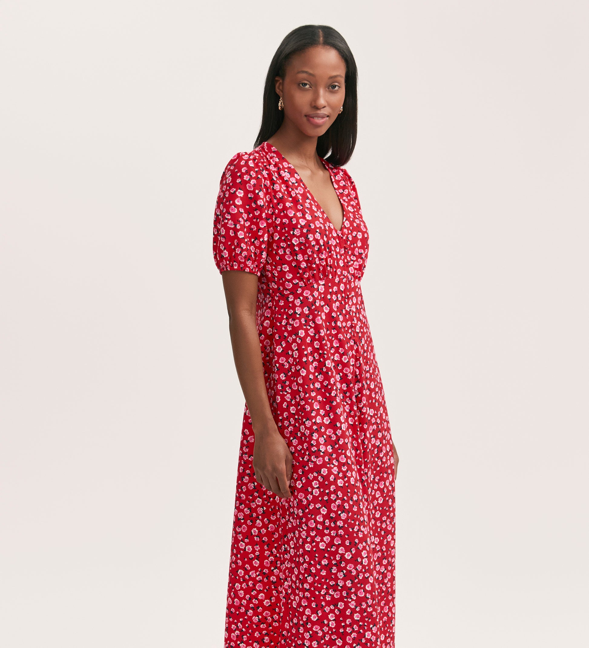 If you're looking to add a pop of colour to your wardrobe, look no further than our Robyn red ditsy floral midi tea dress. Featuring a flattering V-neck, short puff sleeves, and button-down style, Robyn is crafted from our crease-free crepe fabric.