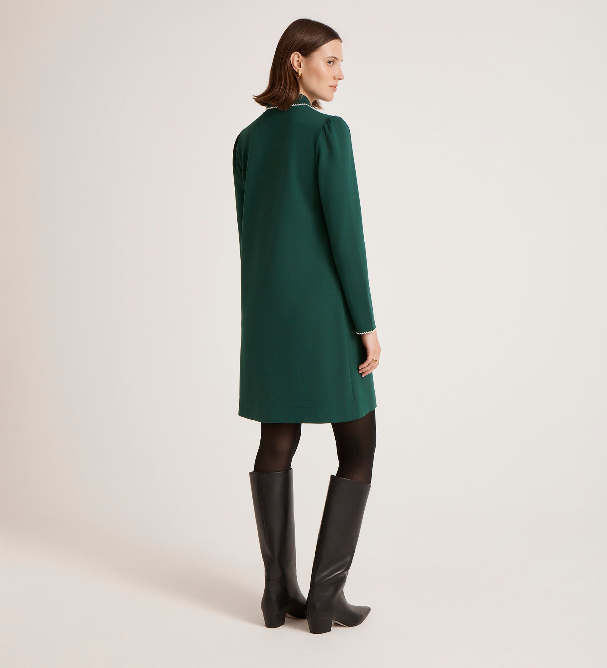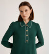Ronnie is a polished mini dress with a playful twist. Designed with a collared neckline and front placket detailed with contrast picot trim, she's finished with gold buttons for a touch of shine. Crafted from structured Ponte Jersey, Ronnie balances comfort with a flattering fit, while her long sleeves and mini length make her a versatile piece that works from desk to dinner with ease.