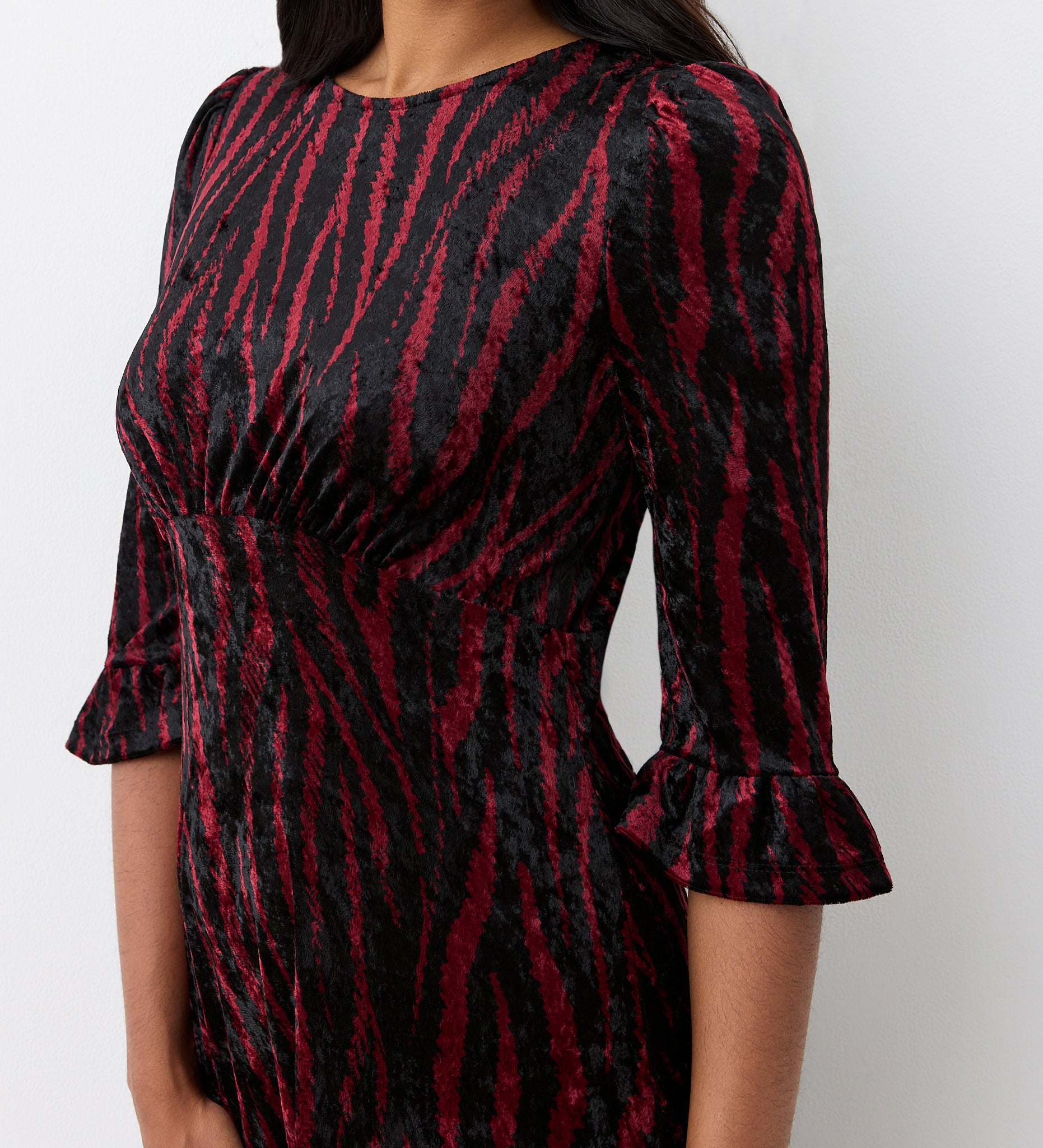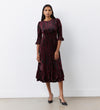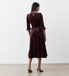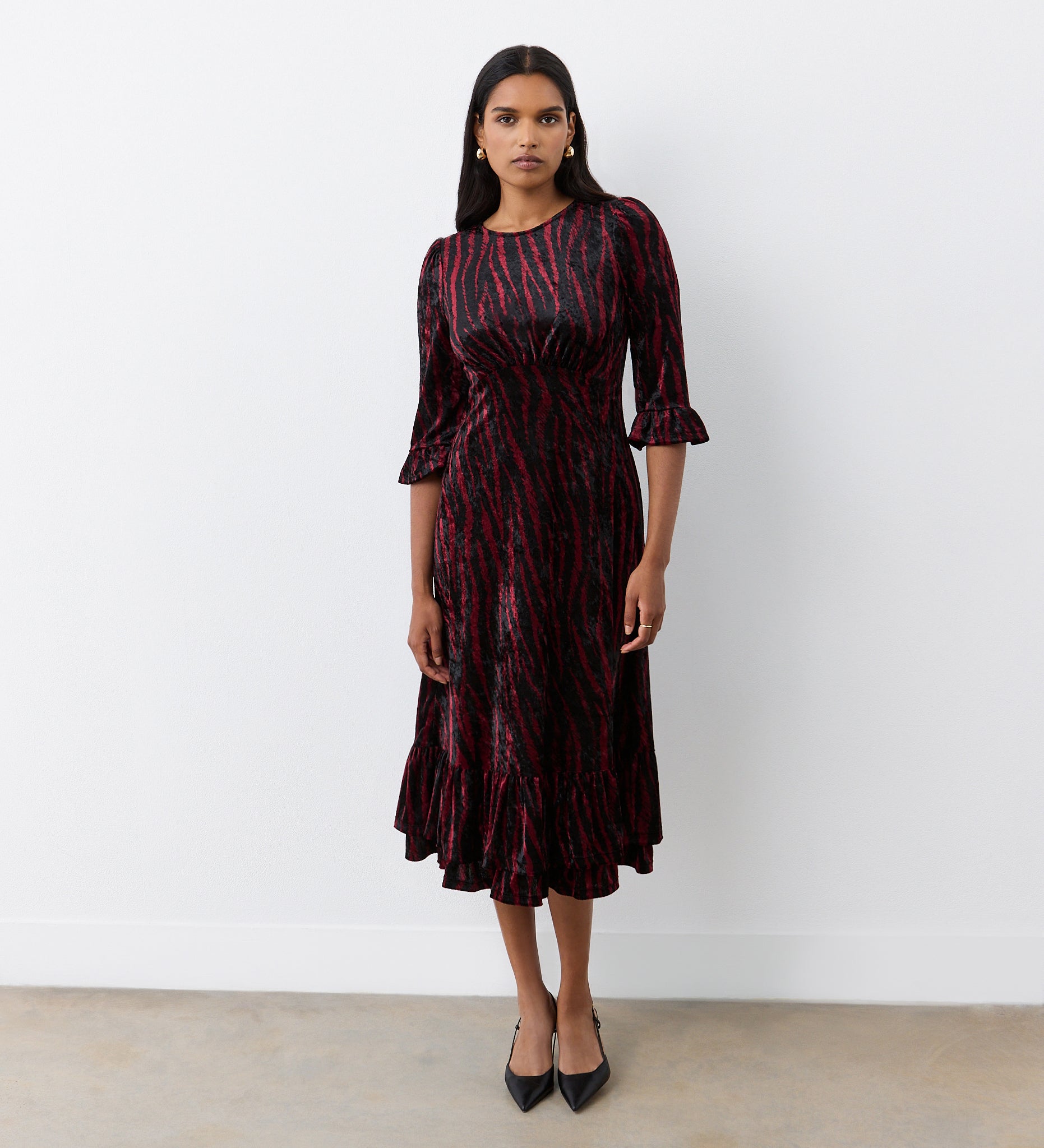 Meet Rosaline, with a slim fitting bodice, perfectly shaped to define and flatter the figure. Ruffled skirt hem and elbow-length sleeves are edged with a tiered velvet trim. Also featuring a keyhole fastening at the back, pair with knee high boots or strappy heels.