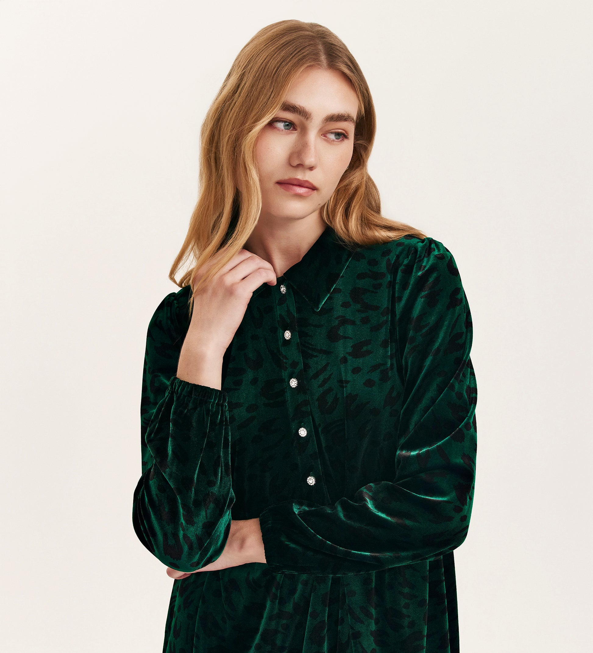 Rosanna is a relaxed-fit mini dress crafted from plush jersey. Designed with a classic collared neckline and button-front opening, she features long sleeves with elasticated cuffs. The tiered skirt adds gentle movement and a touch of feminine charm, making Rosanna perfect for effortless day-to-night style.