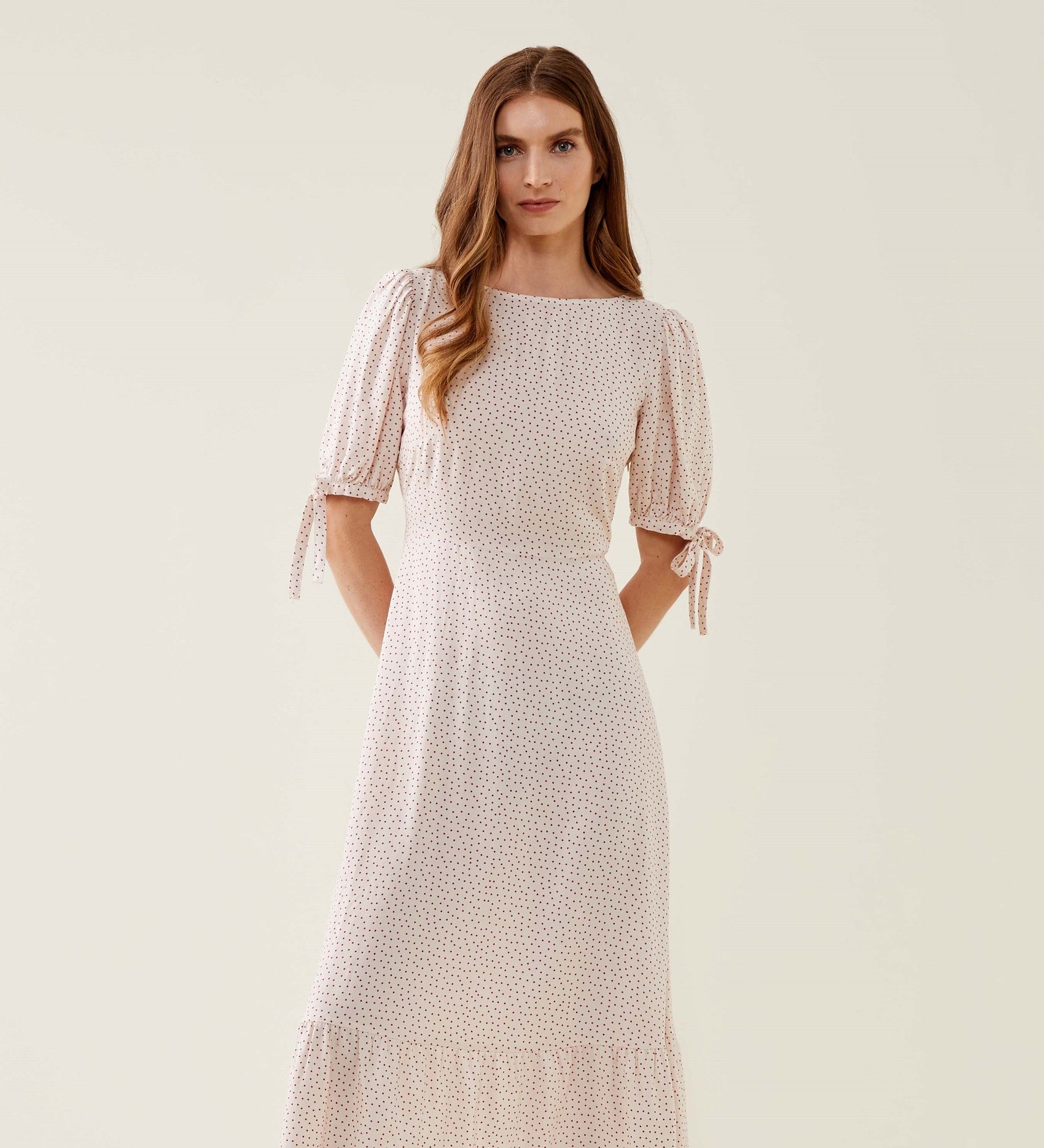 We can't help but think of sophistication when we lay eyes on Ruby. In a red spot print that's crafted from viscose this long midi dress creates a beautiful silhouette and provides plenty of movement thanks to its tiered hemline. With keyhole button fastening and a side zip, you can guarantee this dress will be a comfortable, flattering fit. Note also the short sleeves with on-trend tie-cuff detail.