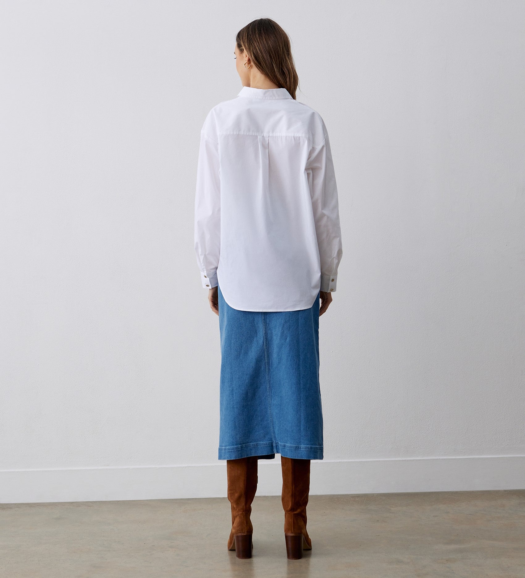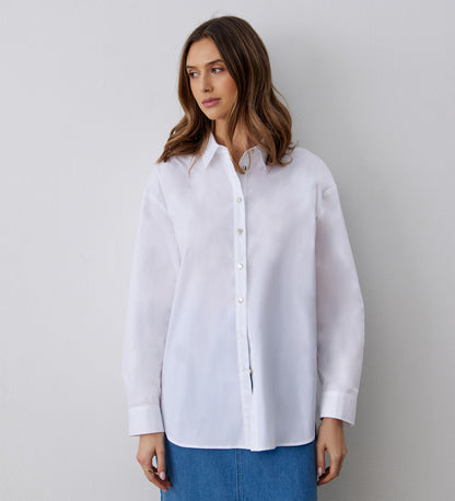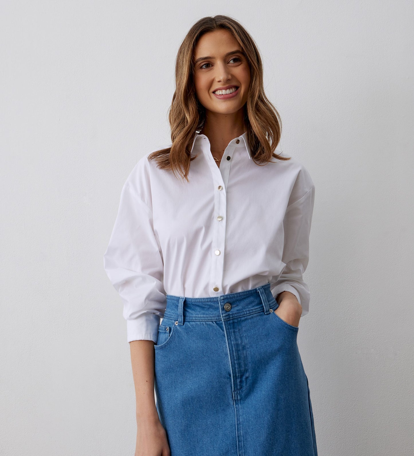 Saphire is our classic white shirt - she is a wardrobe essential. With a traditional collar and gold button-through in style, pair yours with jeans, trousers or a skirt, the style possibilities are endless.