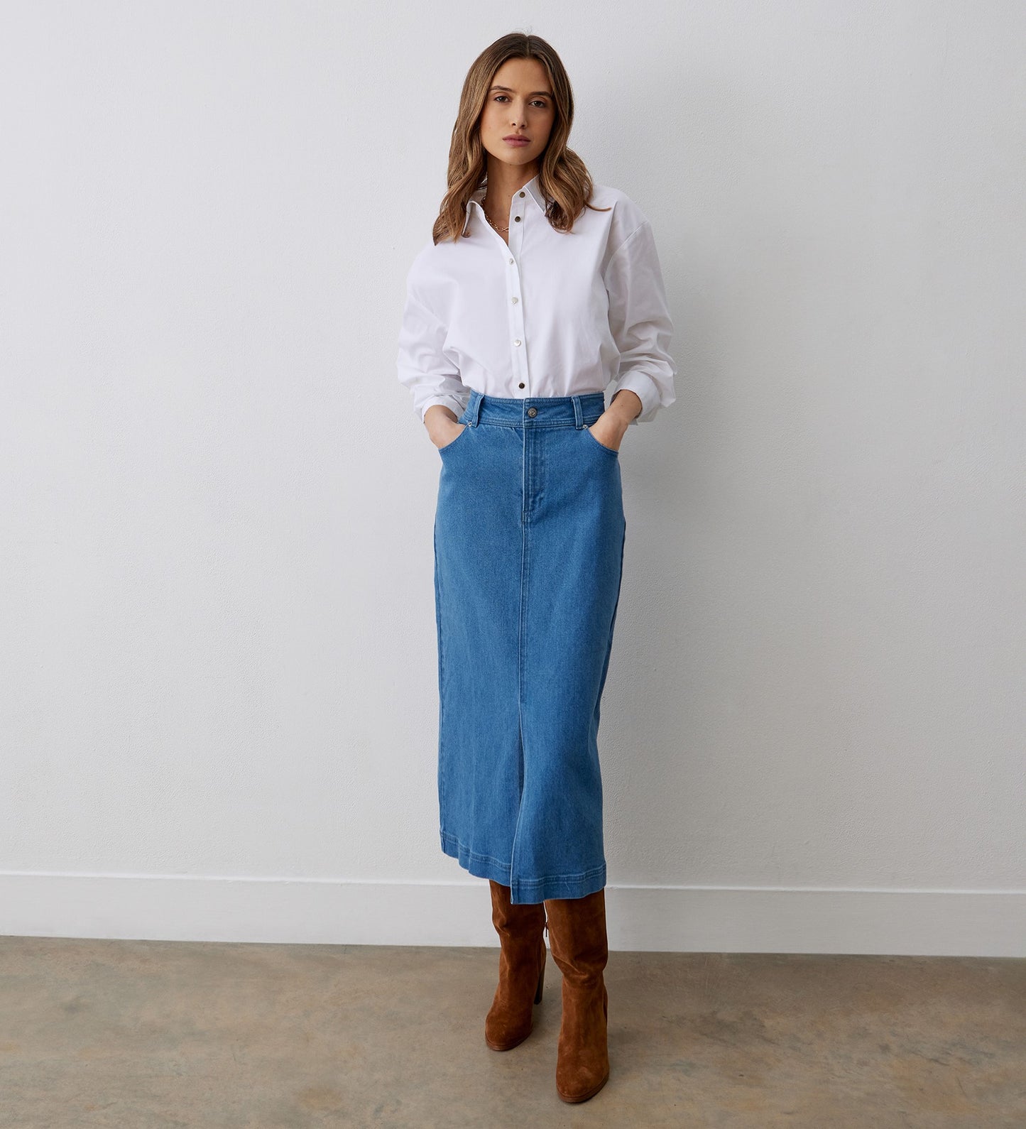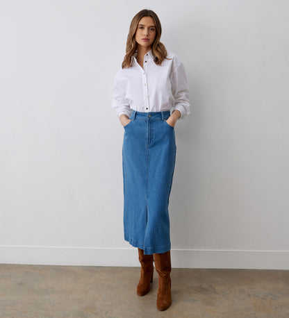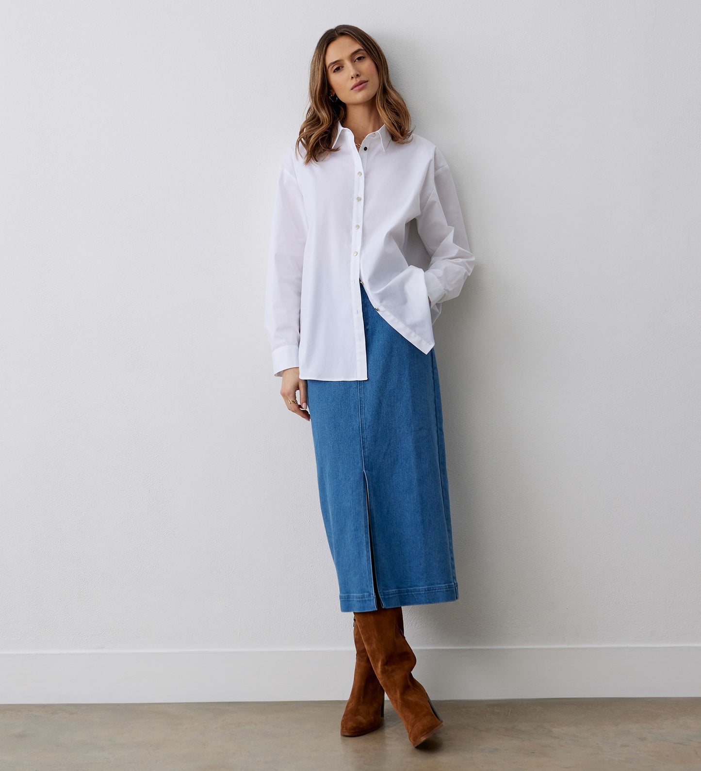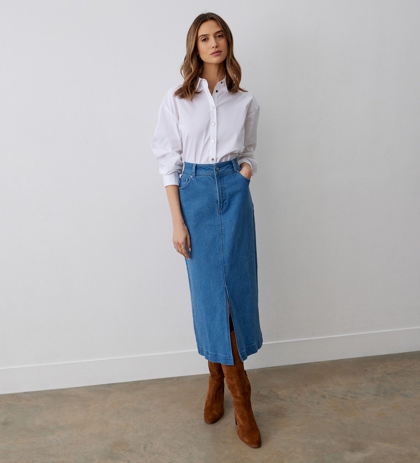 Saphire is our classic white shirt - she is a wardrobe essential. With a traditional collar and gold button-through in style, pair yours with jeans, trousers or a skirt, the style possibilities are endless.