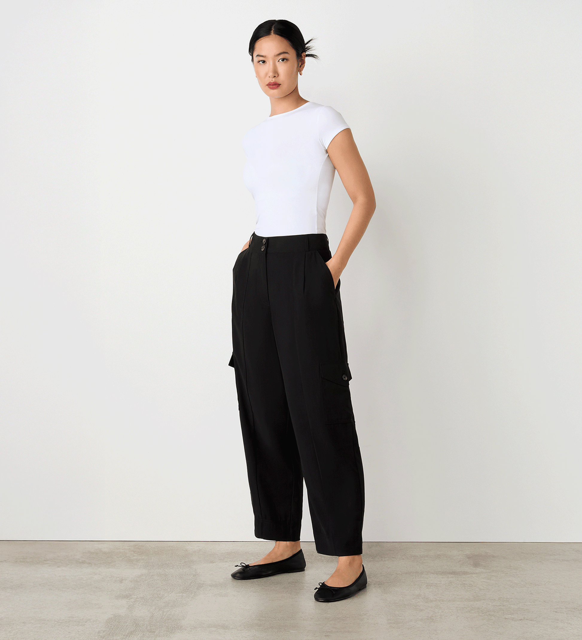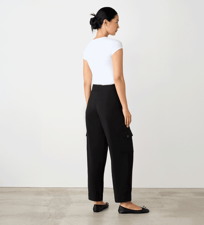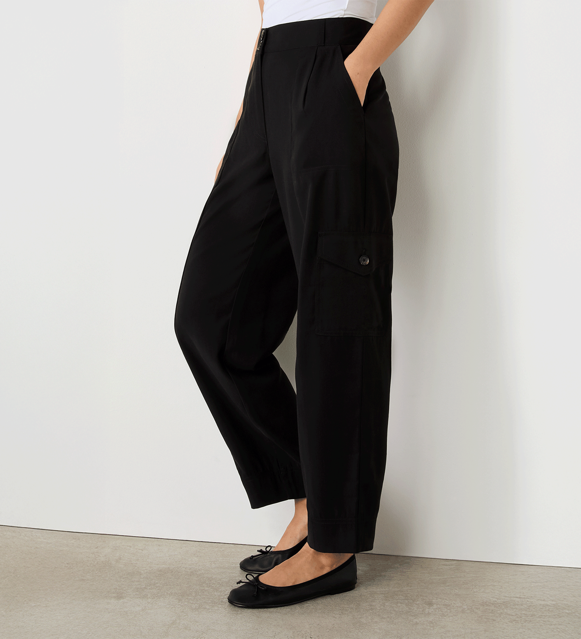Crafted from our soft Cupro twill fabric and offering a flattering high-waisted style, our Sara black cargo trousers feature cargo-style patch pockets, seam detailing and button and zipper fastening at the front.