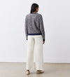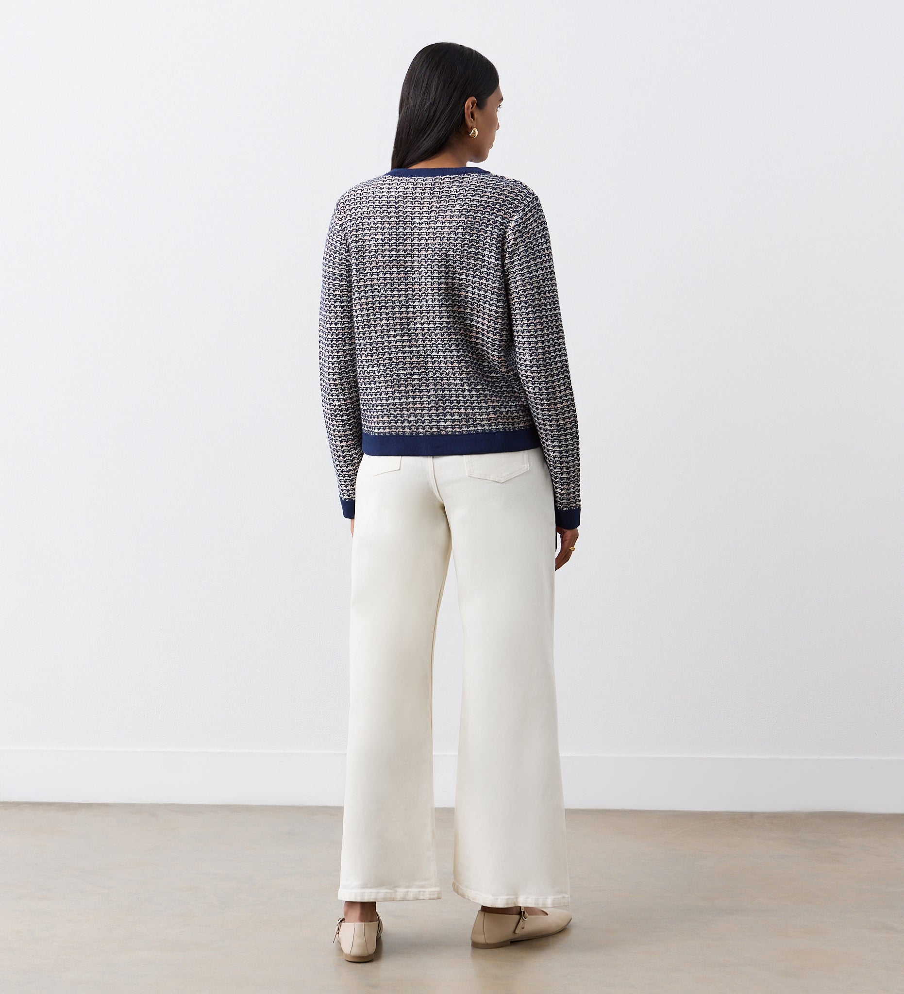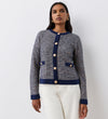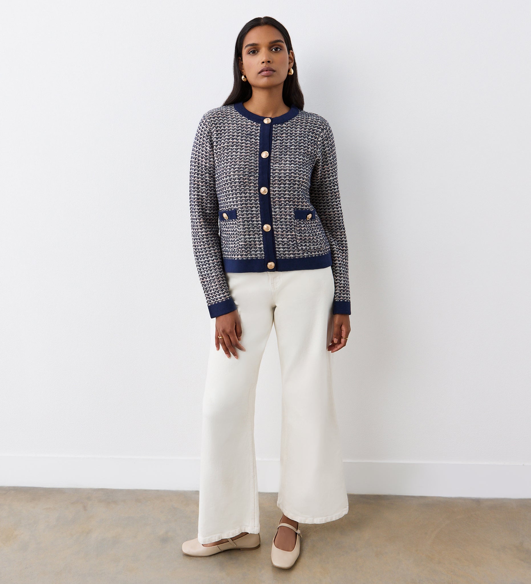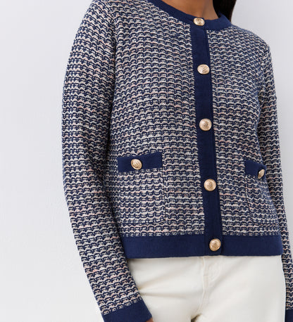 Meet Sasha, our striped knit cardigan with metallic yarn and eye-catching gold buttons. Sasha also features font pockets with button detail and a round neckline.