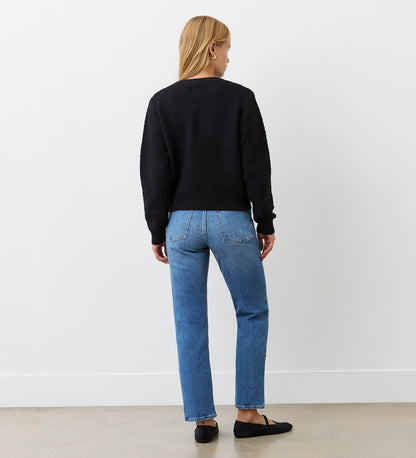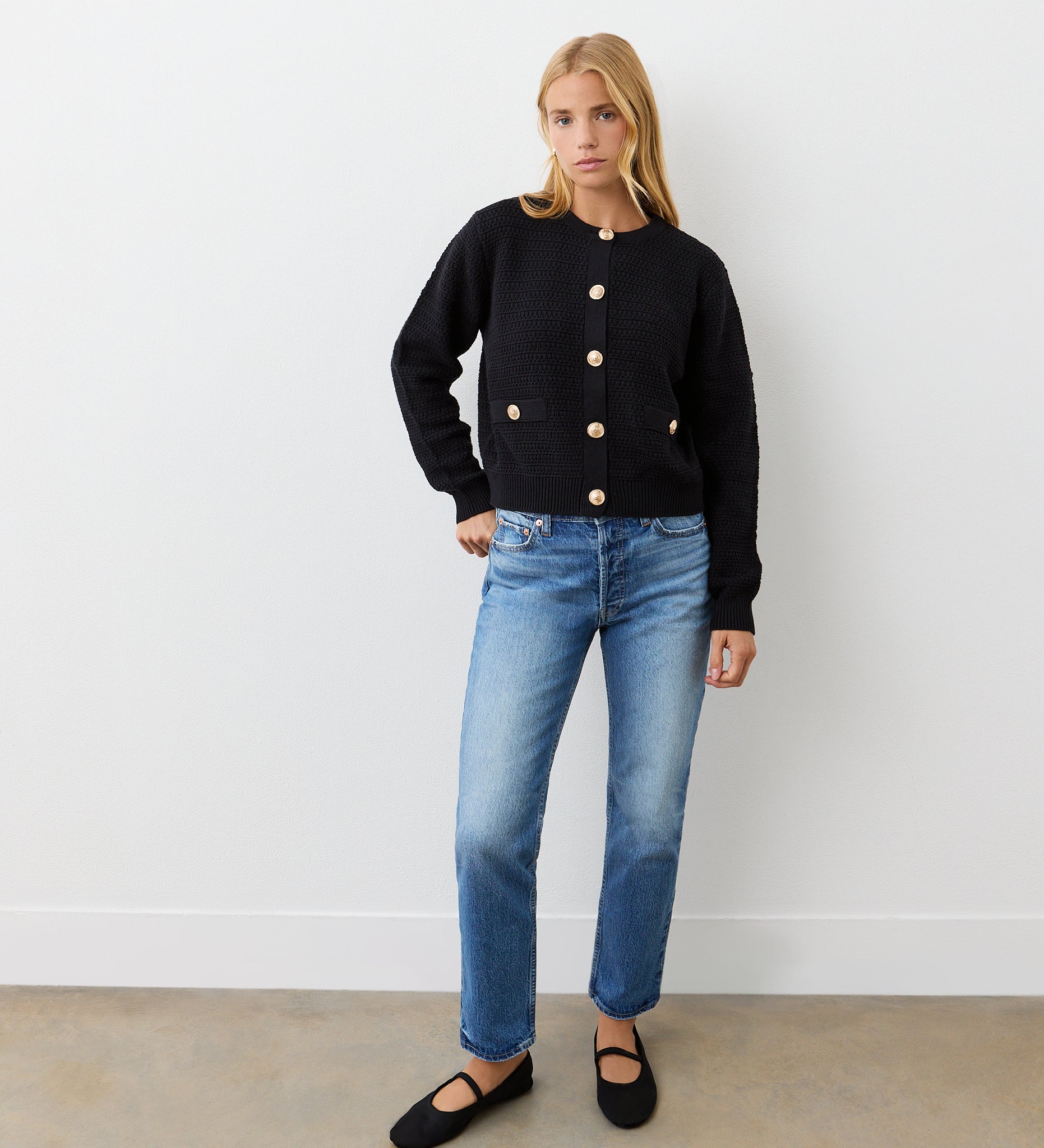A black crew neck button-up cardigan, Saskia features eye-catching gold crest buttons and faux front pockets. She also features ribbed detail on the neckline, placket and cuffs.