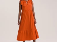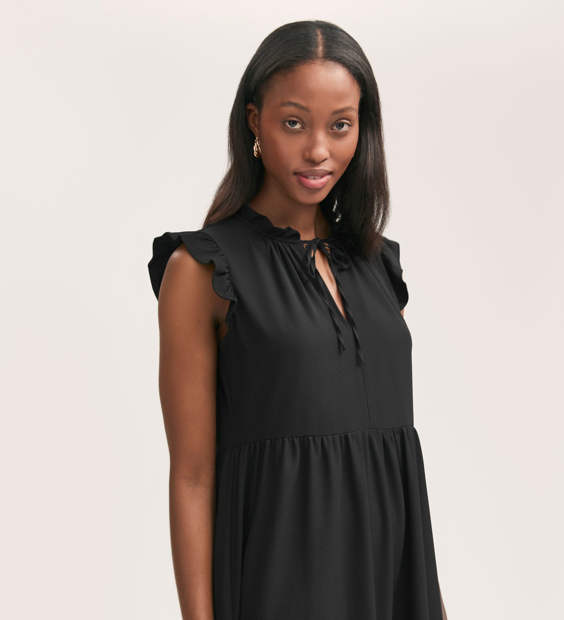 A black sleeveless midi dress, crafted from crease-free crepe fabric, Scout is a relaxed-fit, tiered dress with frill and tie detail at the neckline and shoulders.
