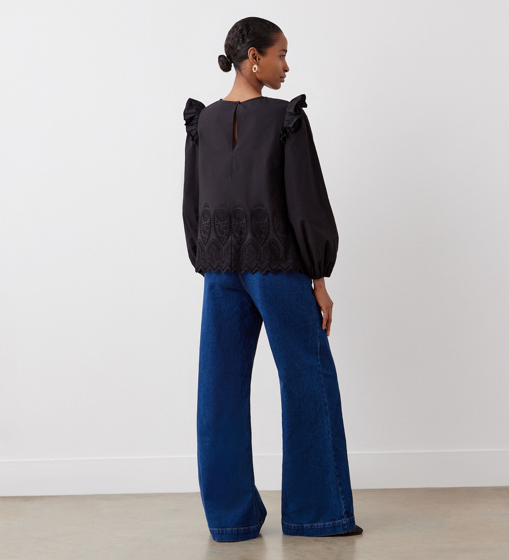 We love this frill shoulder detail on our 100 cotton Serena Blouse. Long blouson sleeves flow into elasticated cuffs and a cut out broderie detail hemline features a scallop detail edge. Rear keyhole and button fastening makes for easy dressing.