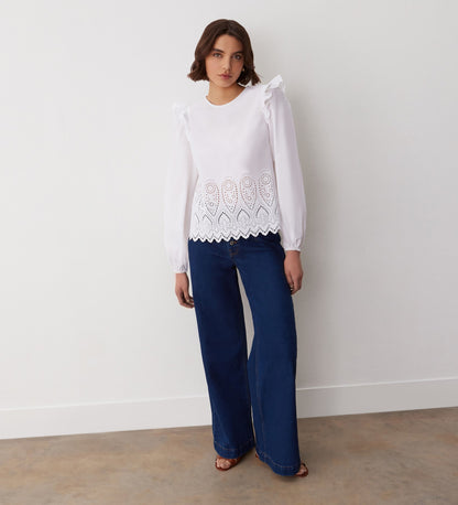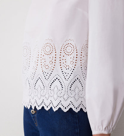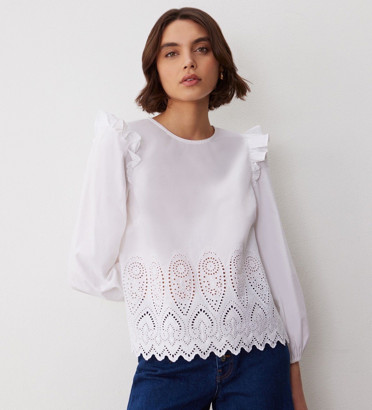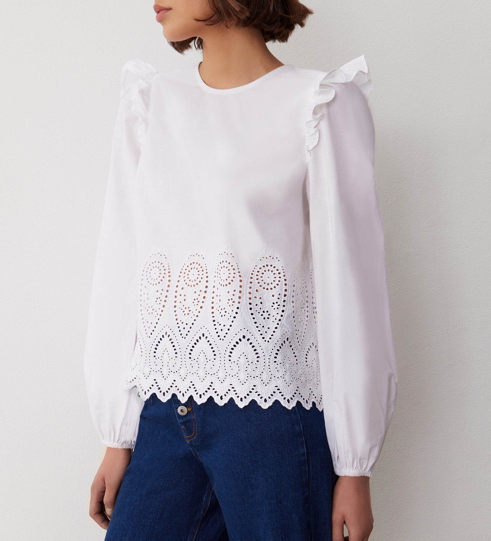 We love this frill shoulder detail on our 100 cotton Serena Blouse. Long blouson sleeves flow into elasticated cuffs and a cut out broderie detail hemline features a scallop detail edge. Rear keyhole and button fastening makes for easy dressing.