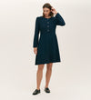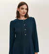 Shauna is a chic mini dress that combines timeless tailoring with subtle statement details. Designed with a classic round neckline, she's accented by polished gold button detailing and delicate pleats. The waisted silhouette is defined by a side seam zip for a clean finish, while long sleeves balance the shorter length. Crafted from our signature crepe fabric, Shauna brings an elevated edge to both daytime and evening occasions.