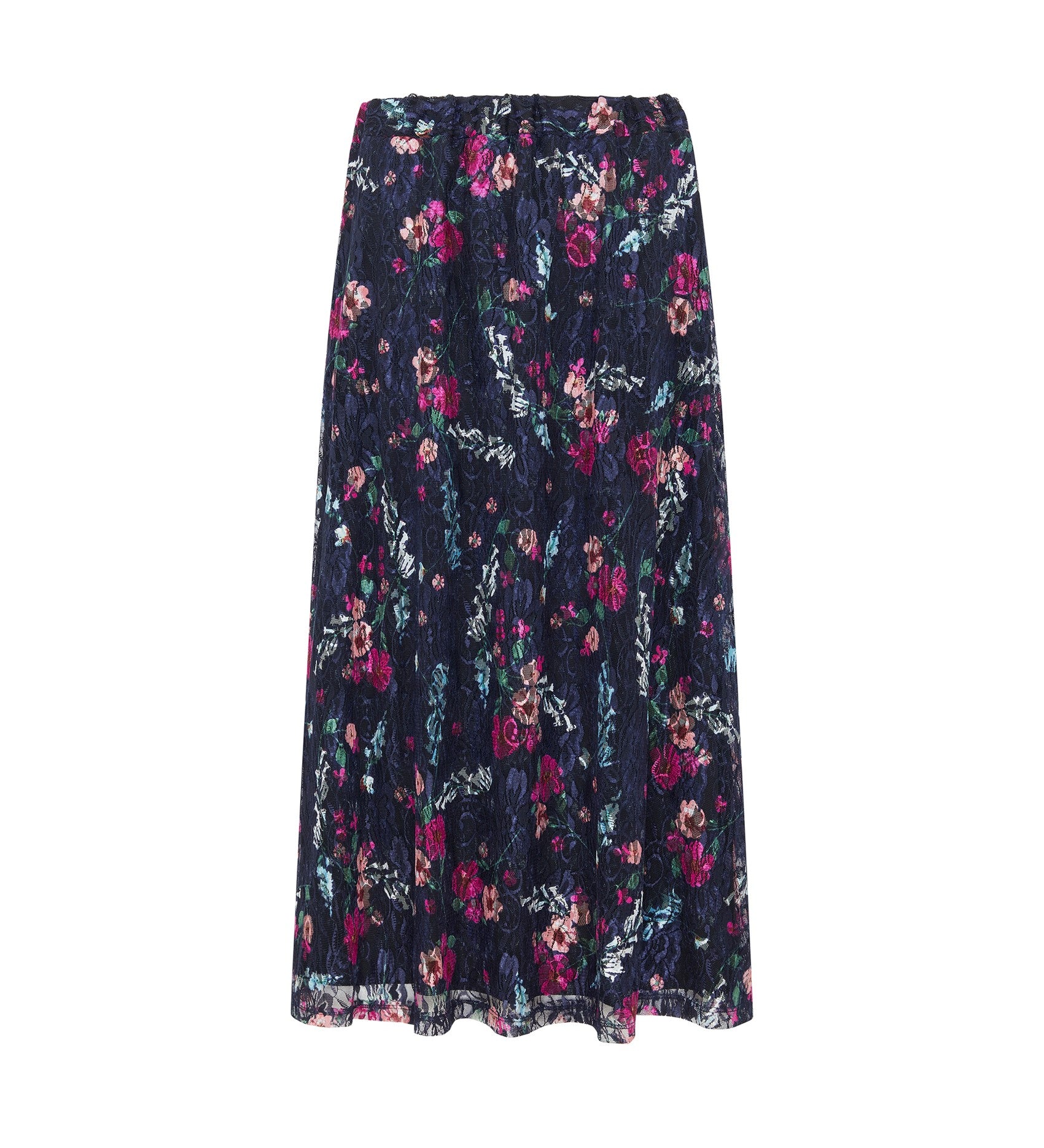 Crafted from luxurious lace, our navy floral steph skirt has arrived in perfect time for party season. Midi in length, Steph can be paired with a blouse or turtleneck, heels or boots.