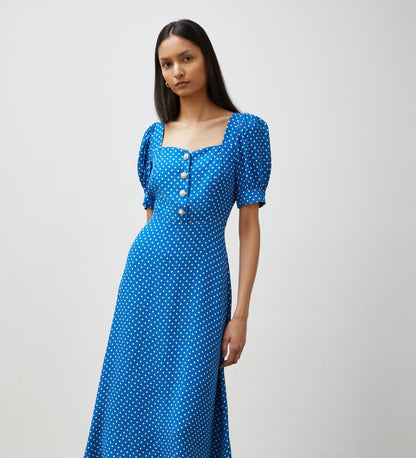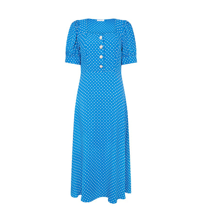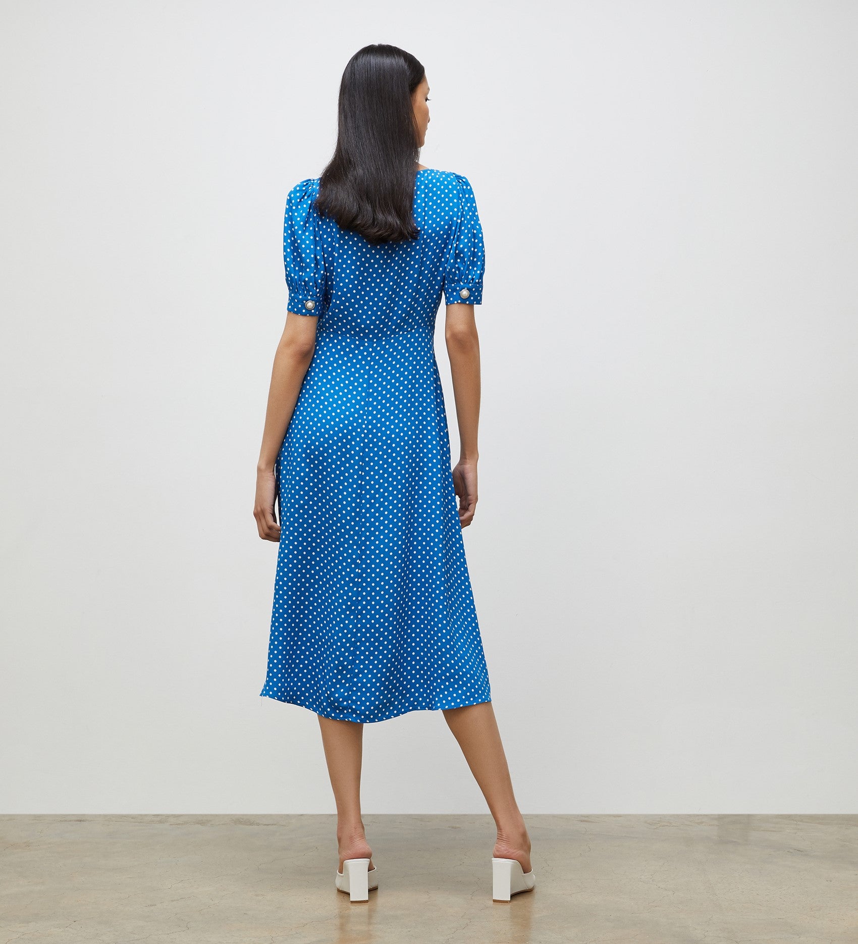 Meet Talise, a midi-length dress that will see you through spring and summer in style. Made in our lightweight satin viscose, it features a sweetheart neckline with gorgeous pearl buttons to the waist. The short sleeves feature cuff and matching pearl button detail and provide soft volume, adding to the romantic vibe of this wear-anywhere style that can be dressed up or down to suit the occasion.