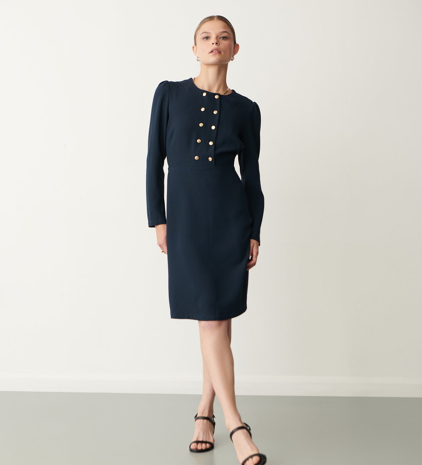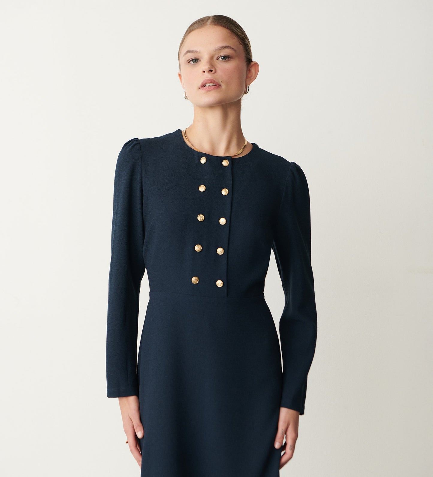 Cut from our signature crepe, Tally is a knee-length dress with double front button detailing. Semi-fitted in style, she creates a feminine silhouette.