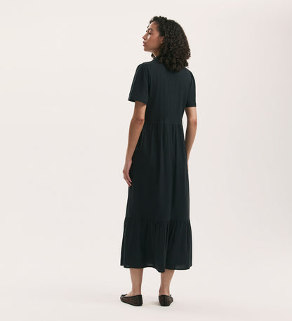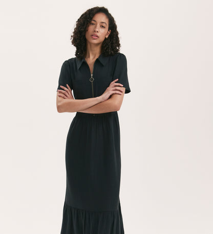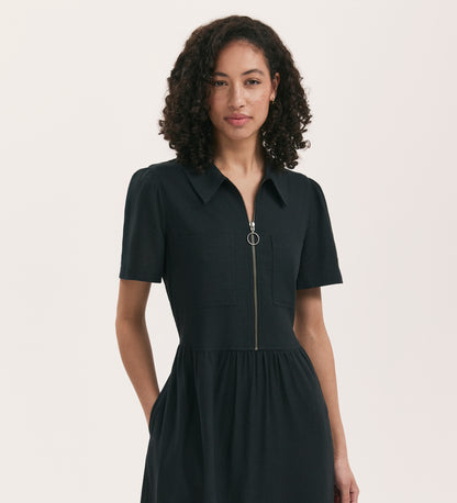 With a zip front, Tania is a relaxed fit black midi shirt dress, crafted from our linen blend fabric. She features short sleeves, collar detail and a tiered skirt.