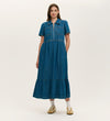Tania is a relaxed fit maxi dress that transitions seamlessly from casual days to weekend adventures. Crafted from soft denim, she features a smart collar with front zip closure and short sleeves that create a clean silhouette. Functional front and side pockets add practical style, while the tiered skirt brings gentle volume and movement.