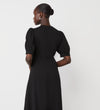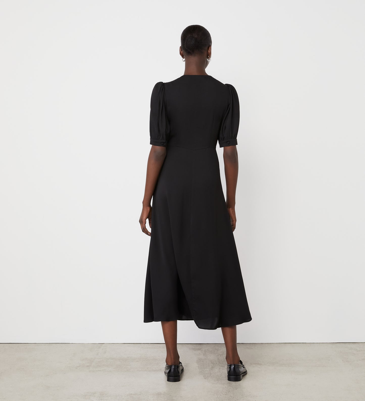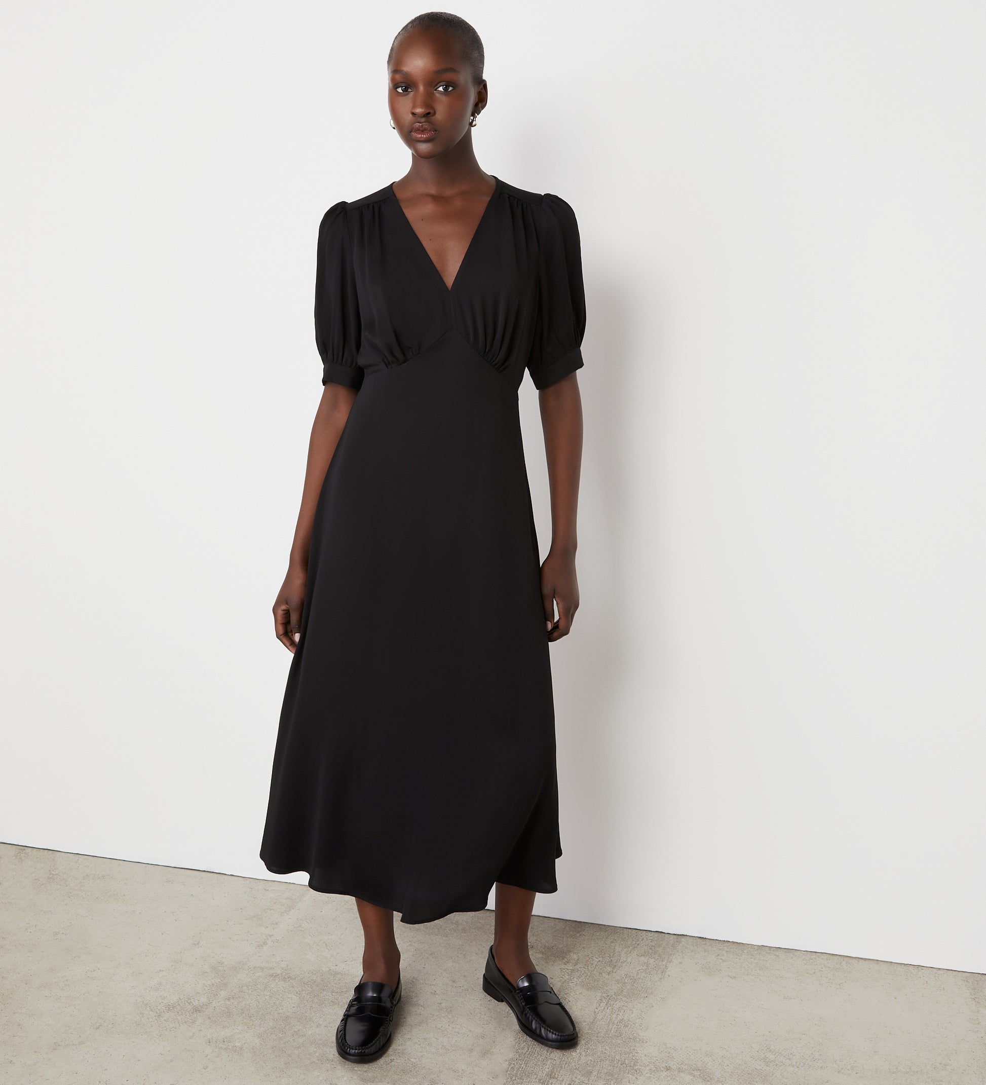 A classic shape midi dress, Tara features a feminine v-neckline and short puff sleeves with cuff detail. She also has a flattering empire waistband and dropped shoulder gather detail.
