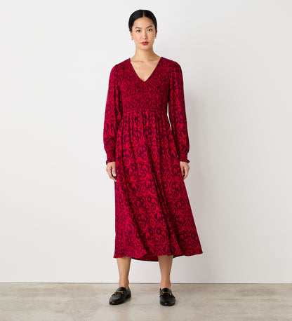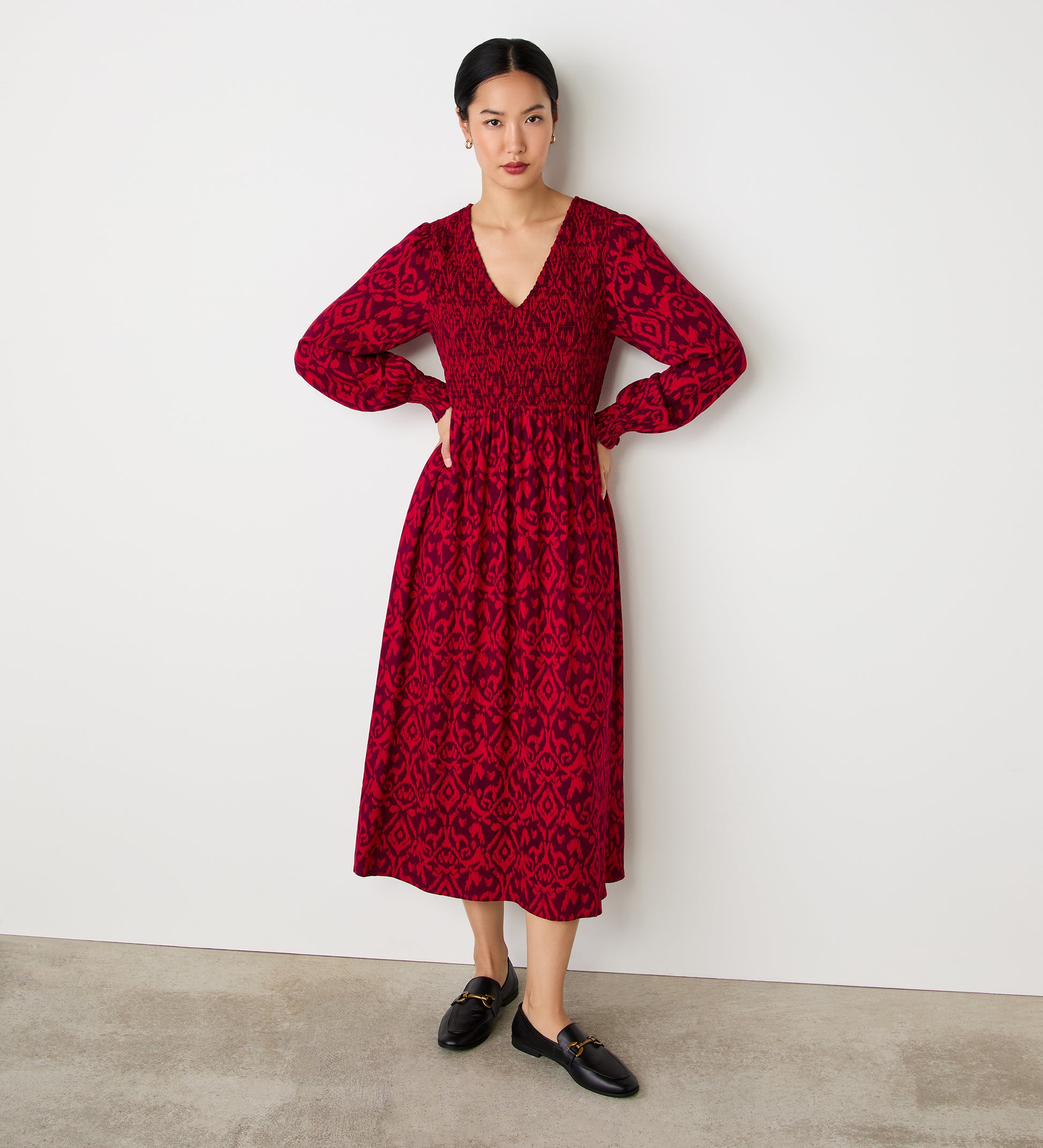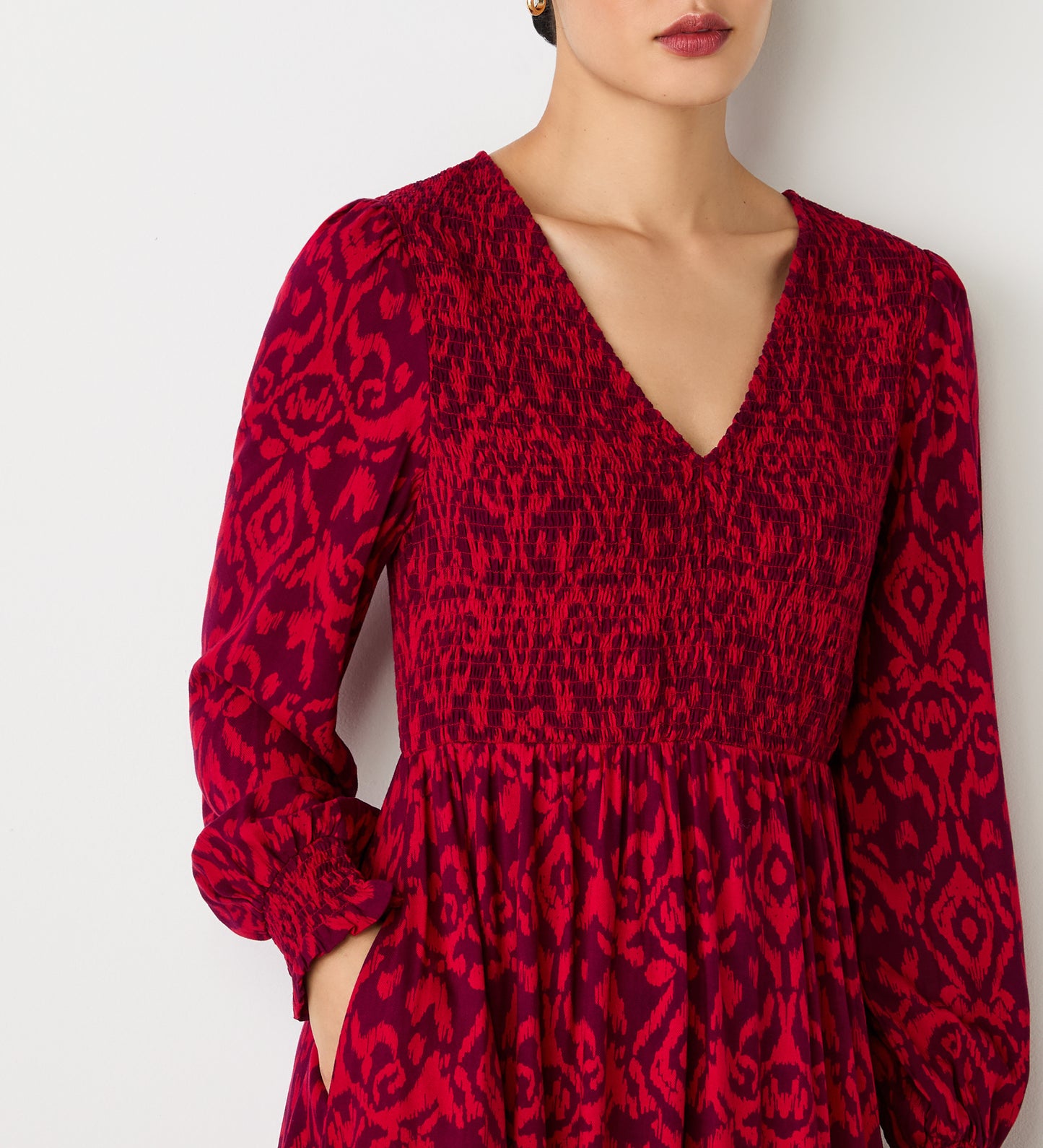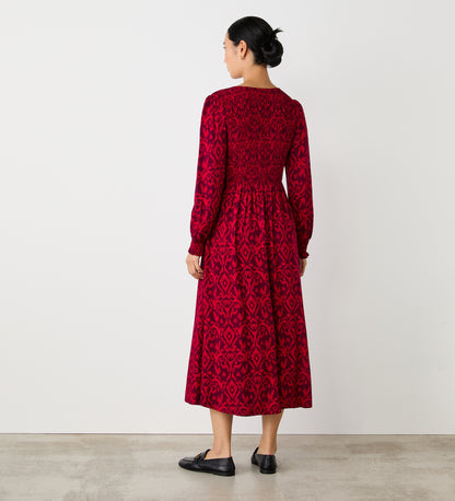 With a shirred bodice that accentuates the waist, Tasmin is a pink ikat long-sleeve midi dress that will see you through season after season. A versatile wardrobe addition, she features a feminine V-neck and long sleeves with matching shirring detail at the cuffs.