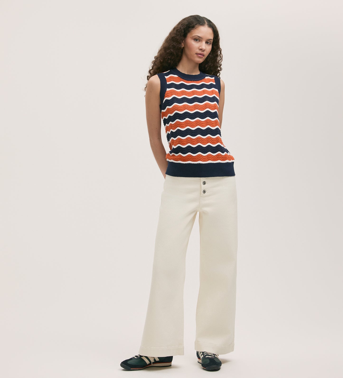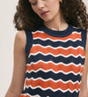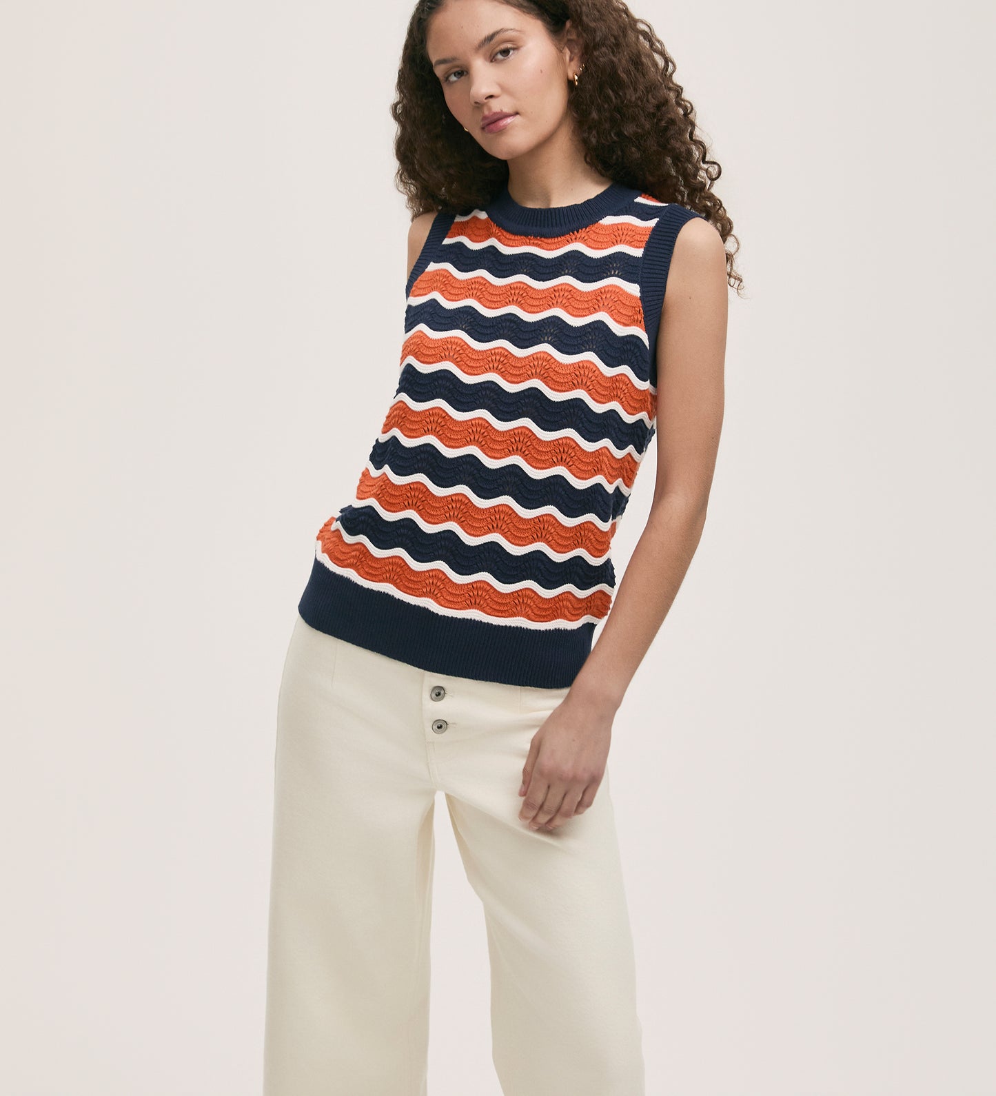In an eye-catching wavy design, Taylor is a navy and orange striped crochet sleeveless vest with ribbed detailing on the armholes, hem and neckline.