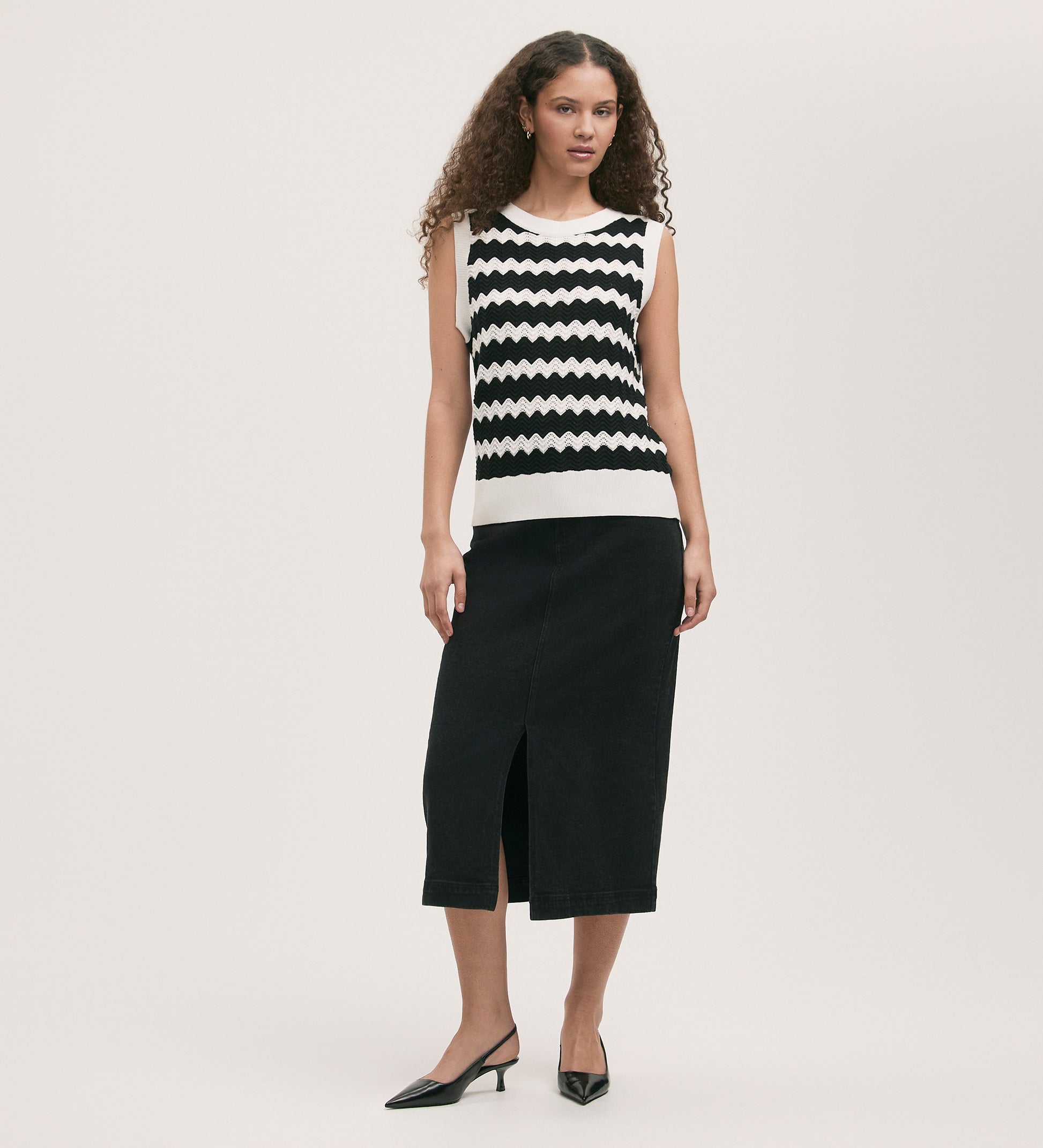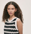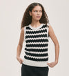 A versatile wardrobe addition, Tessa is a black crochet sleeveless vest in a zig-zag striped design. She features a crew neck and has ribbed detailing on the armholes, hemline and neckline.