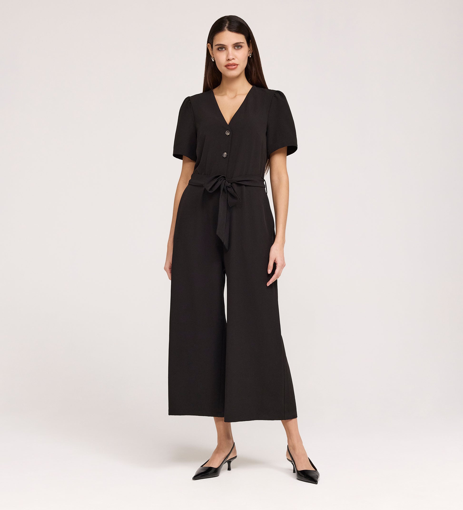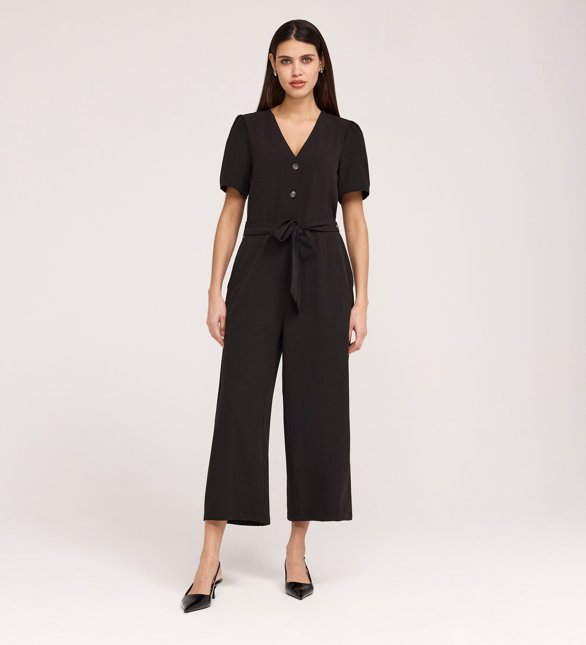 Uma Jumpsuit offers a fresh take on one piece dressing, blending a sharp, utilitarian feel with a relaxed silhouette. It features a classic V neckline and a button through front that fastens to the waist seam, where an adjustable tie waist detail allows you to define your shape. The short sleeves and wide leg cut create a balanced look, while the cropped length makes it the perfect partner for everything from casual trainers to a block heel.
