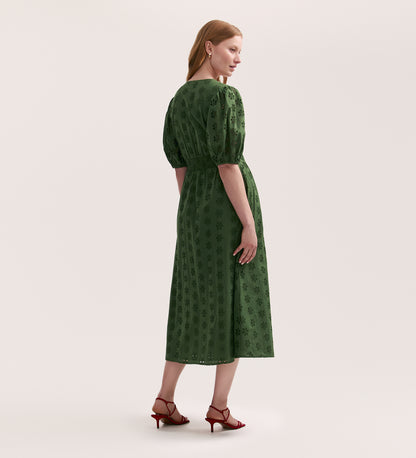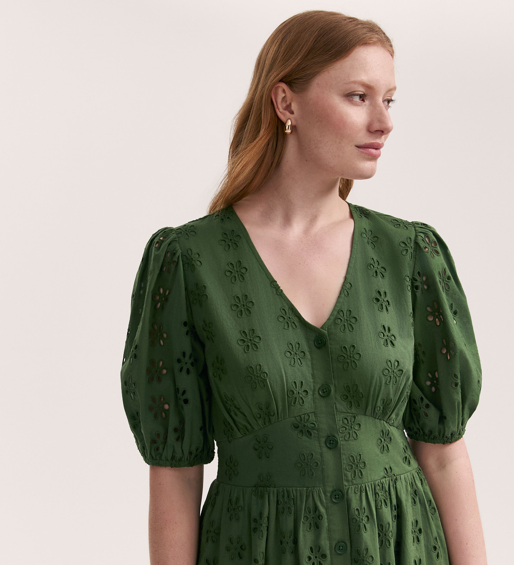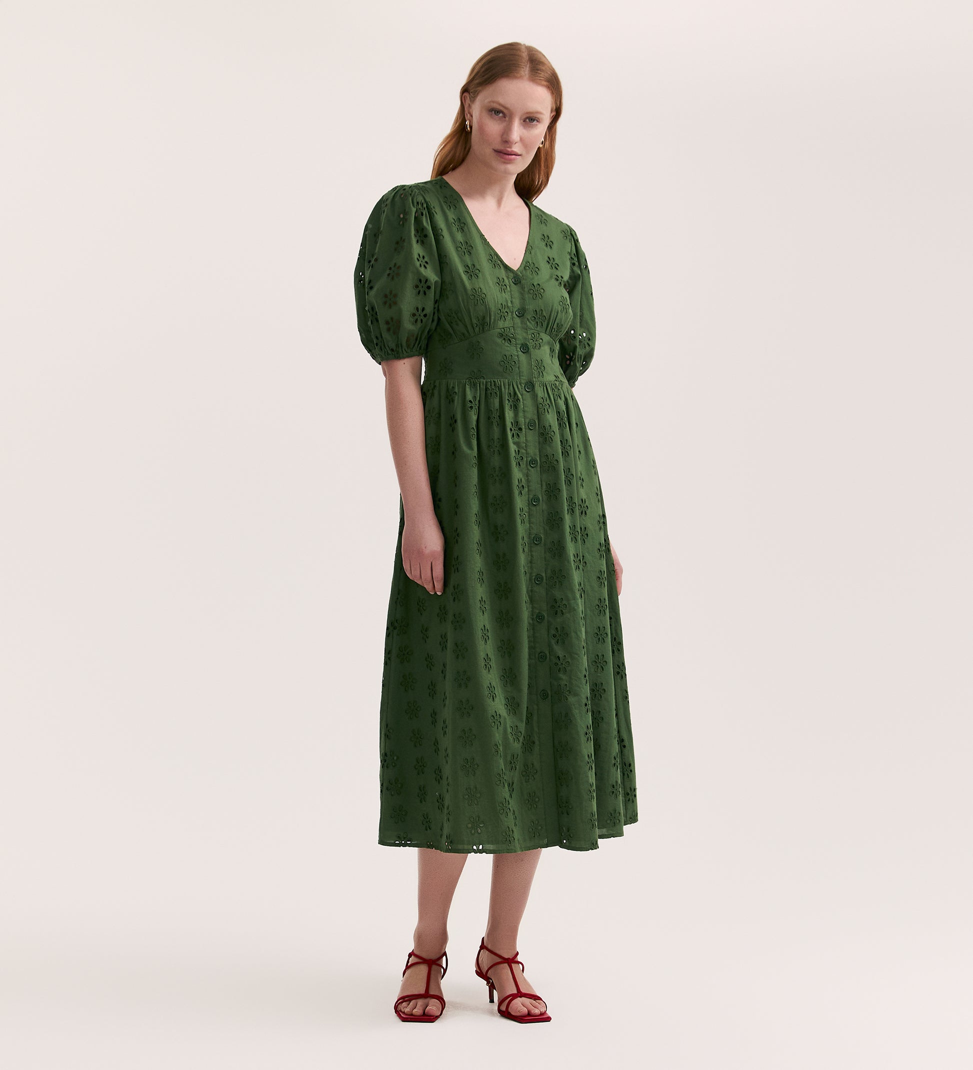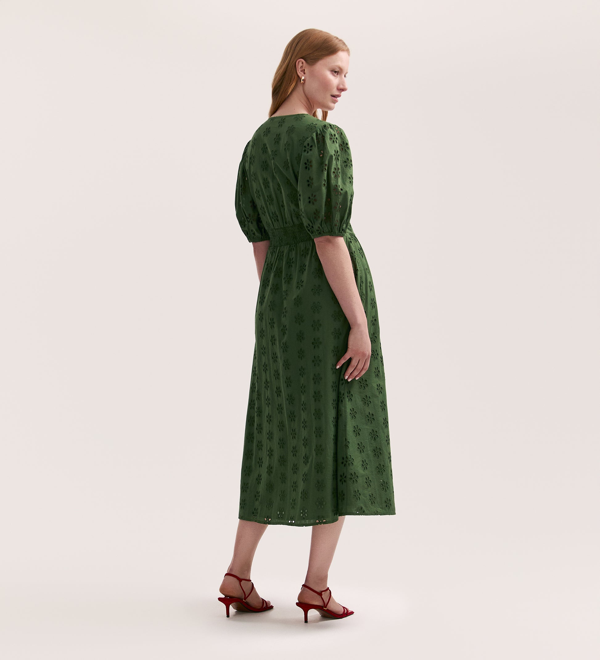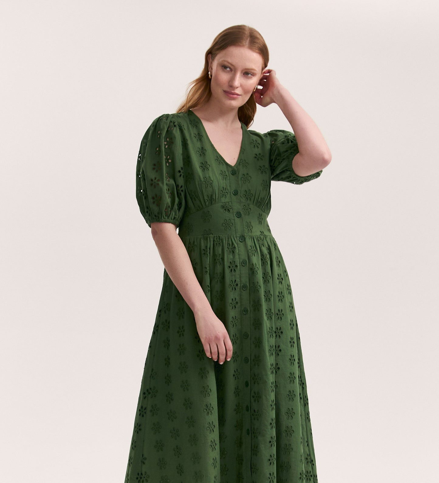 Crafted from cotton, Una is a khaki v-neck embroidered midi tea dress with pockets and short puff sleeves. She also features an empire waist panel with shirring at the rear of the waist for a comfortable and figure-flattering fit.