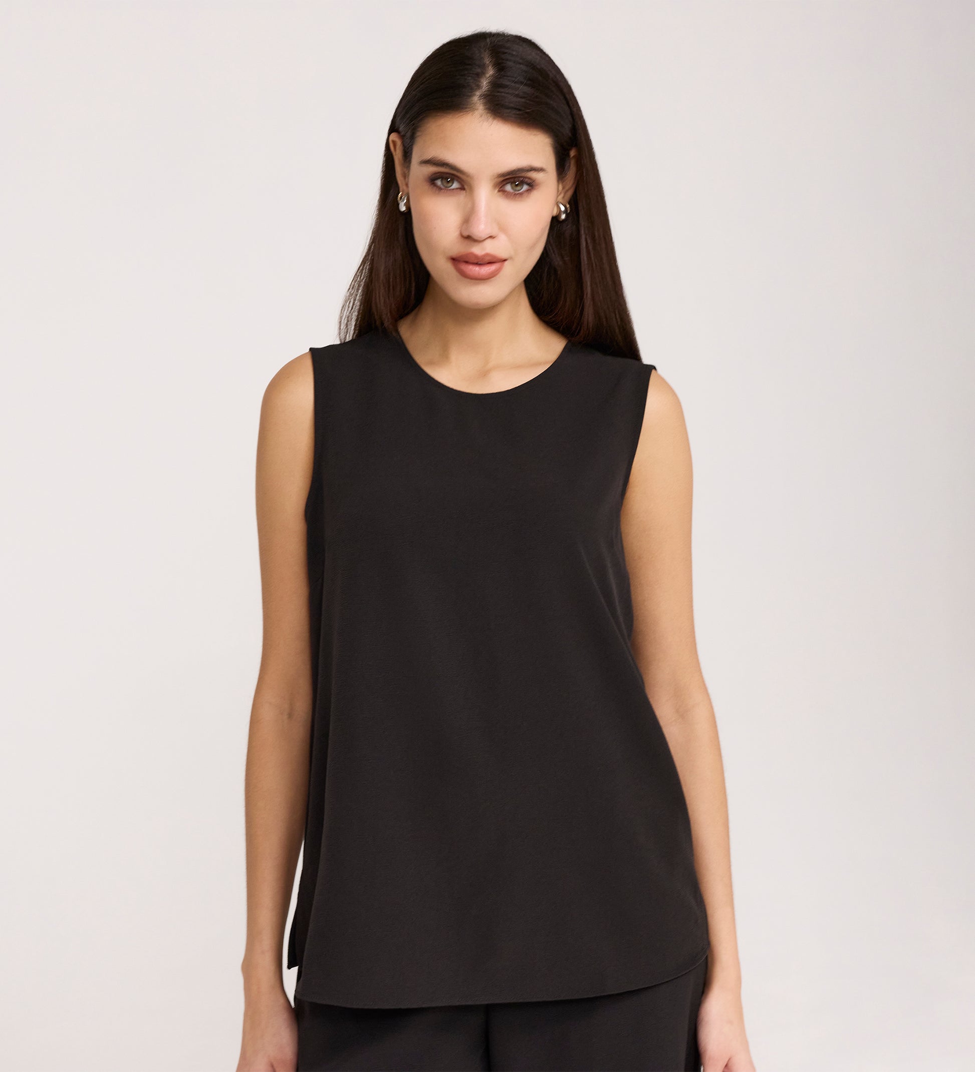 Vallie is our black sleeveless shell top, crafted from our crease-free crepe fabric. Featuring a crew neck and rear keyhole with button fastening, she promotes a relaxed fit and is a versatile addition to any wardrobe.