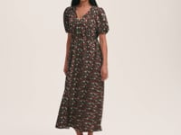 Vittoria is a black floral v-neck midi dress crafted from our crease-free crepe fabric. Effortlessly stylish, she features a comfortable elasticated waistline and short puff sleeves with ruched elastic detailing at the shoulder.
