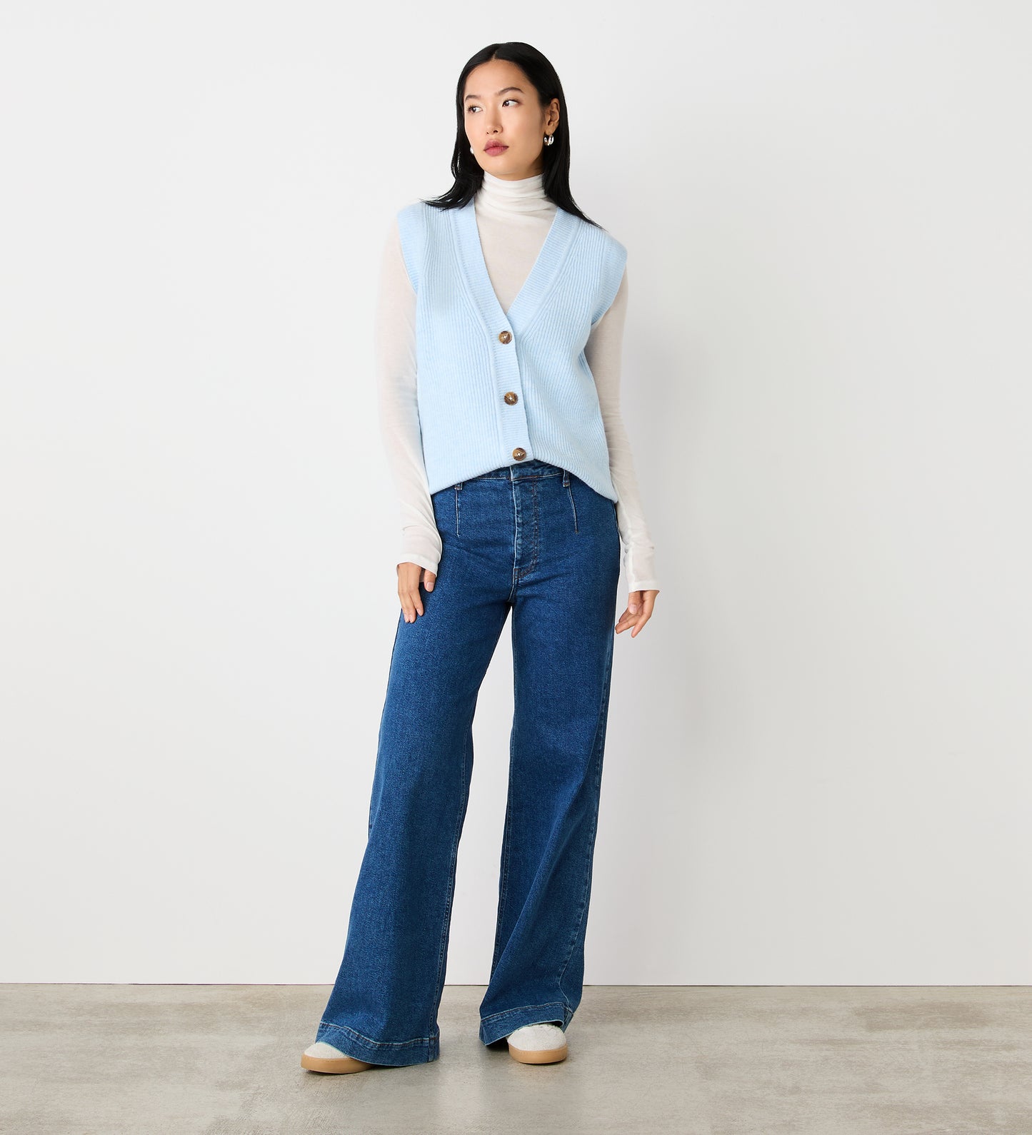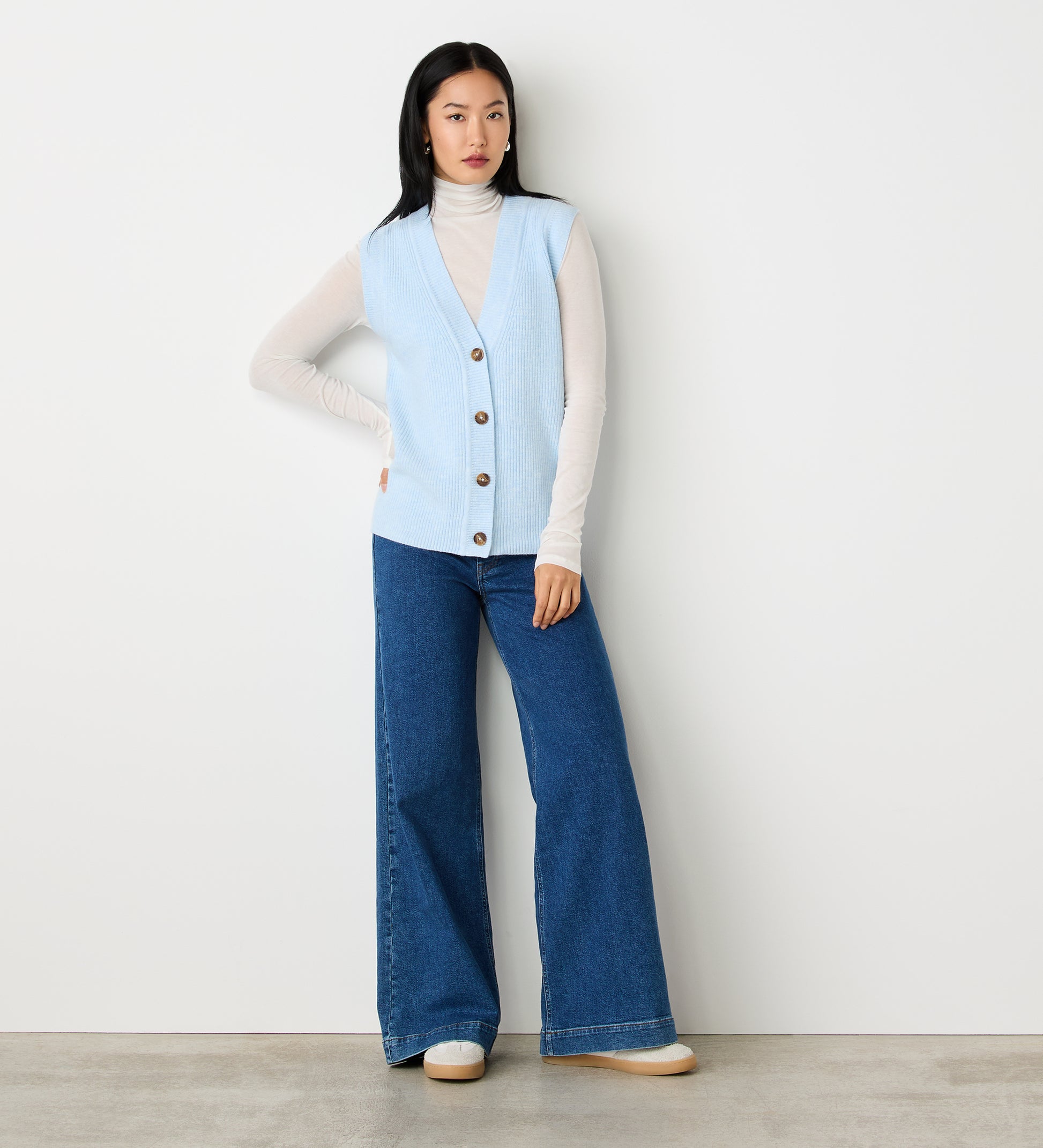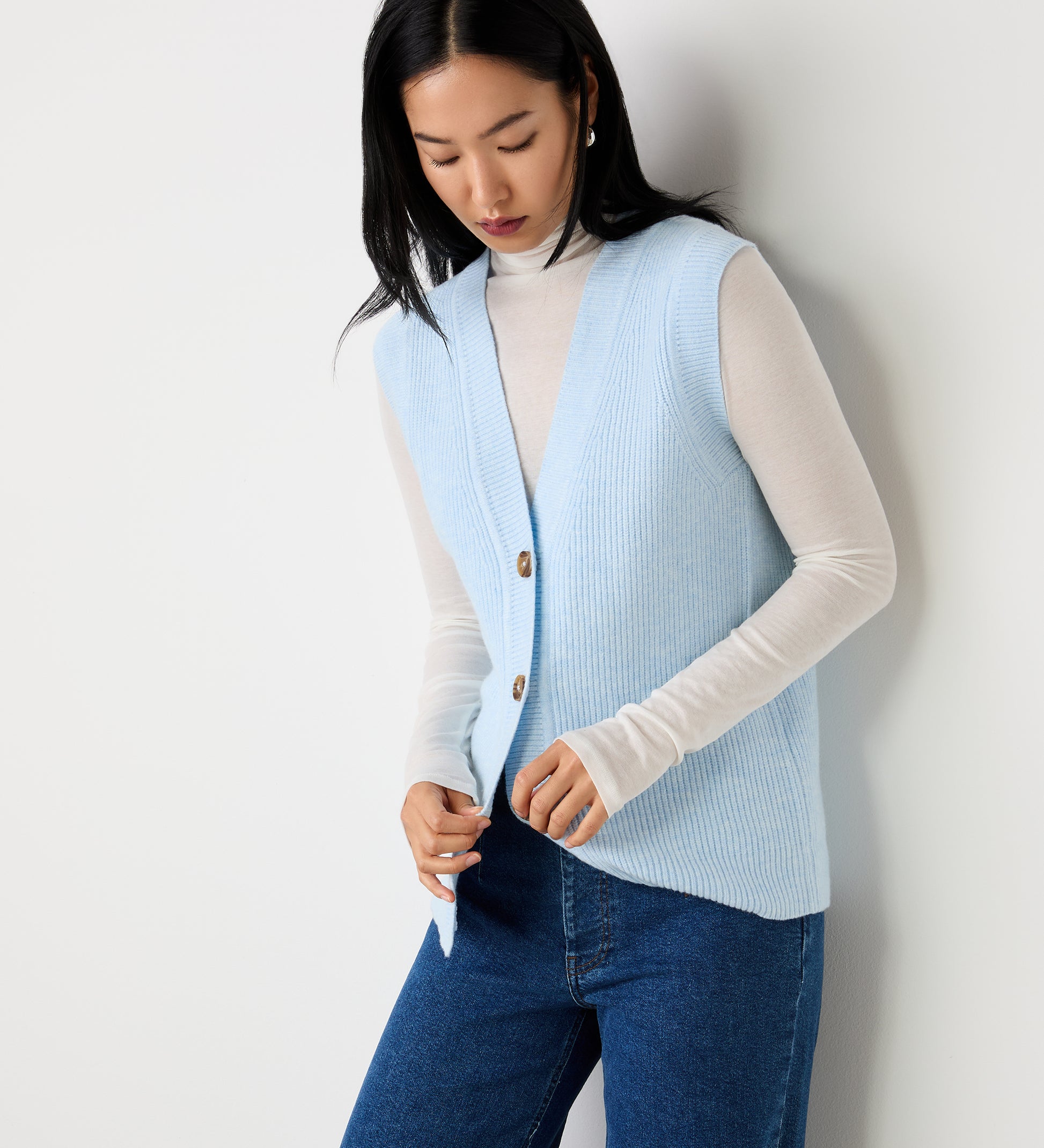 A versatile wardrobe must-have, Winnie is our sleeveless knitted vest with a v-neckline and stylish button front.