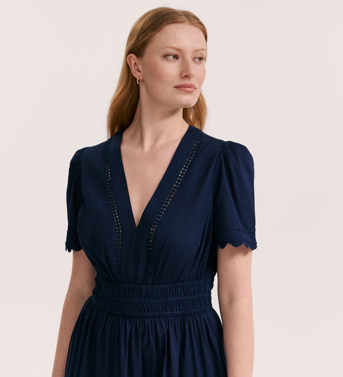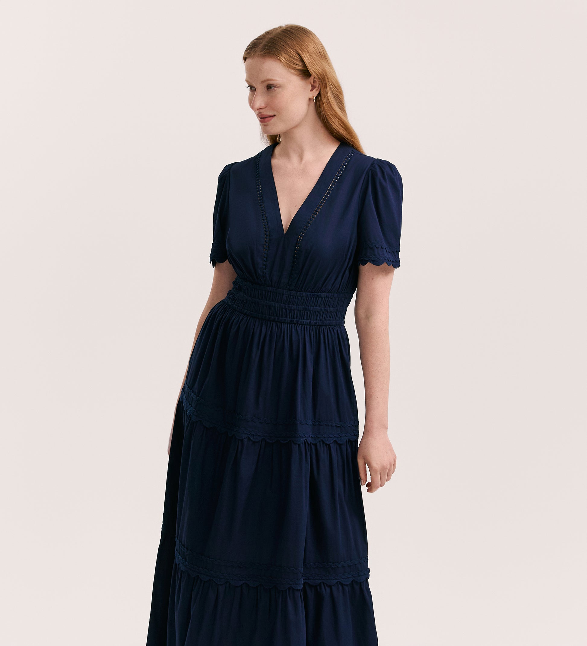 Crafted from cotton poplin, Wren is a black tiered midi dress with ric rac trim detail and a v-neck with delicate lace trim insert. Wren also features elasticated waist detail and short sleeves with scallop detail on the cuffs and hemline.