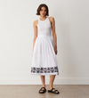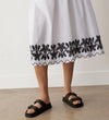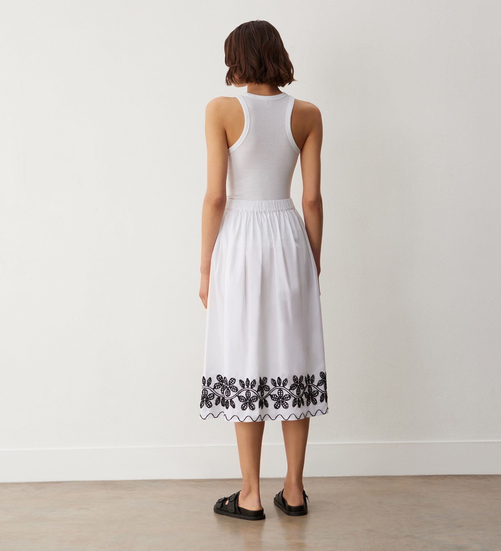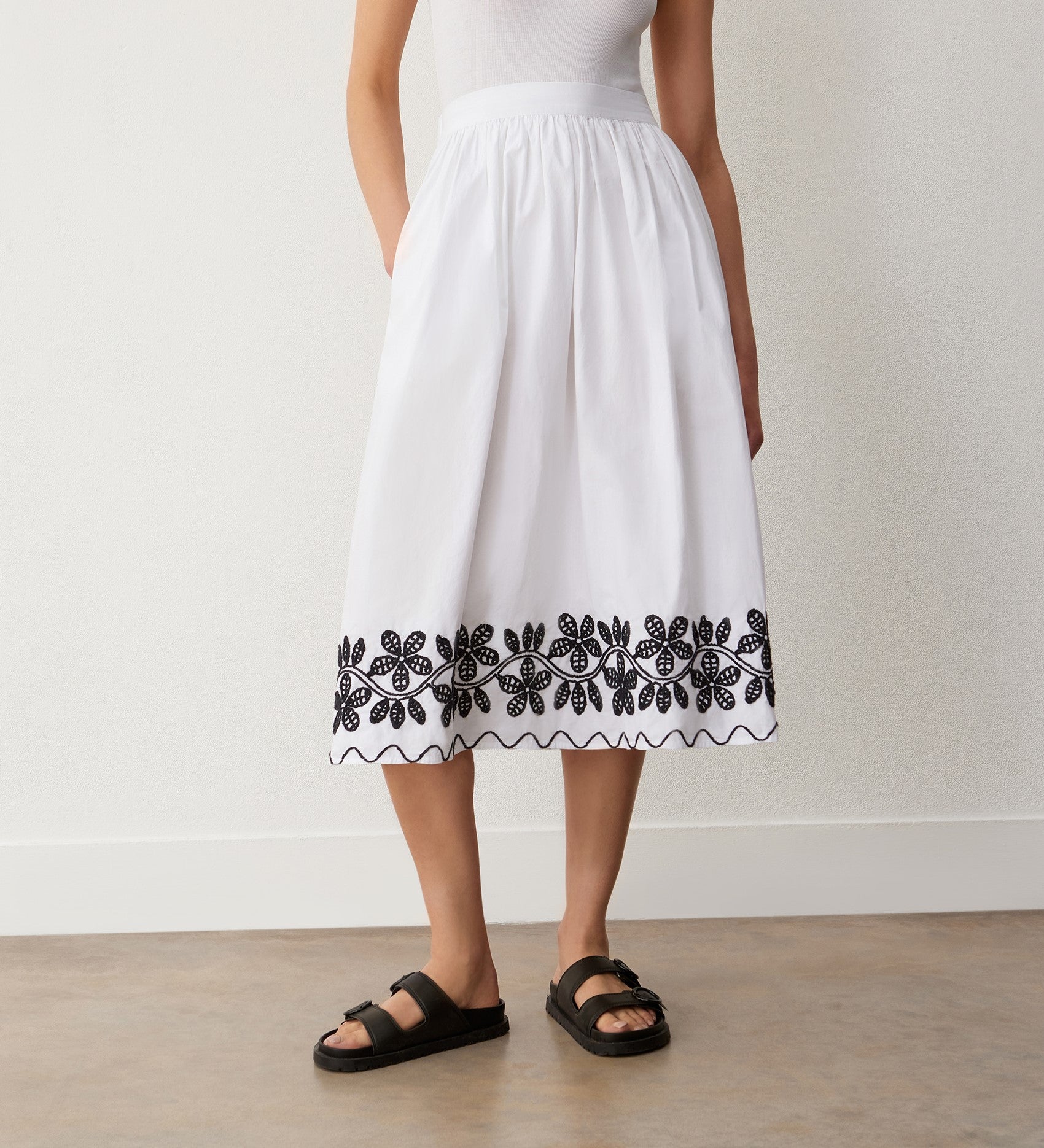 Crafted from 100 per cent cotton, Yolanda is a midi skirt with eye-catching contrast embroidered detail at the hem. The waistband is elasticated around the back for a comfortable fit. She also features functional pockets.